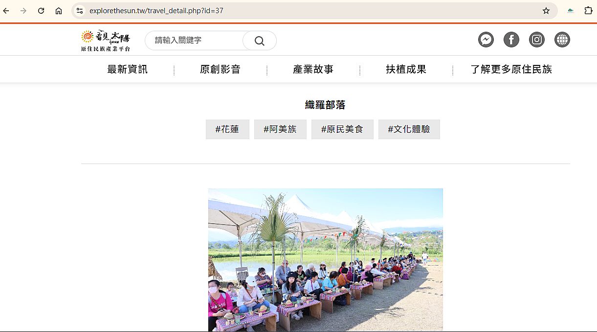 | 5 | ![]() | 網站名稱 看見太陽原住民族產業平台 網址 https://explorethesun.tw/travel_detail.php?id=37 網站簡介 織羅部落位於玉里鎮春日里,原名Ceroh,意為「不斷湧入、不斷加入」,象徵著源源不斷的生命力。因導演齊柏林拍攝紀錄片《看見tai灣》而被廣為認識,部落因其獨特的天然資源和豐饒的農業景觀,積極推動農業產業復興與文化傳承。織羅米86專案結合部落小農和春日國小,開發彩繪米與多元農作物體驗,其中以「葛鬱金」農事體驗最具代表性,讓遊客感受阿嬤的味道記憶與傳統療癒智慧。 織羅米86提供半日與一日遊程,包括社區文化導覽、情人袋製作、稻田腳印餐桌、米彩繪藝術、咖啡品嘗等豐富活動。遊程適合散客及團體,交通便利,火車及花蓮客運可達。這裡不僅是體驗東花蓮農業之美的最佳去處,也是感受在地文化與自然共生的寶地。 | 朱柔棋 | 2025/9/20 上午 11:03:41 |