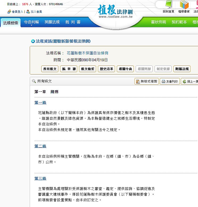 | 3 | ![]() | 網站名稱 植根法律網:花蓮縣樹木保護自治條例 網址 https://www.rootlaw.com.tw/LawArticle.aspx?LawID=B230190000000200-0900419 網站簡介 植根法律網是一個整合全面的台灣法律資料庫,收錄了法規、判例、函釋等重要資訊,我們參考其中的花蓮縣樹木保護自治條例,可以知道花蓮縣對於校園樹木和行道樹的管理規定。 | 郭宥霆 | 2025/9/17 下午 02:08:57 |