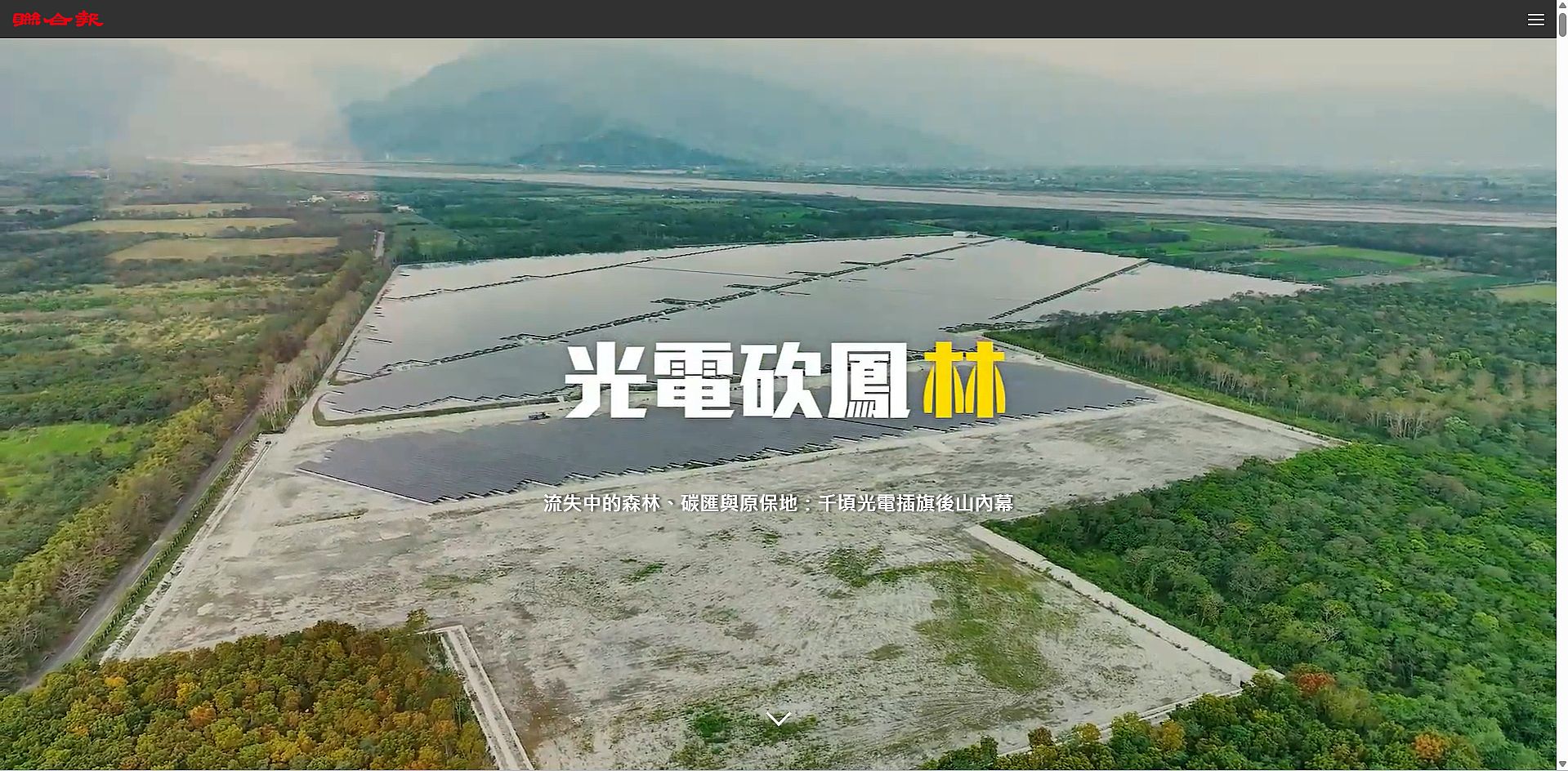 | 3 | ![]() | 網站名稱 光電砍鳳林 網址 https://vip.udn.com/event/newmedia_2023Fenglin 網站簡介 花蓮鳳林鎮因推動太陽光電,大量森林被砍伐,引發居民與原住民族們的反對。去年66公頃的生豐光電場施工期間,數萬棵樹木被砍掉,導致野生動物棲地消失了,也減少大量的碳吸存區域,更違背淨零碳排政策精神。鳳林已有超過30件光電申請案,面積達1700公頃,佔全鎮六分之一! 恐破壞觀光與生態環境。居民和學者呼籲政府納入環評及總量管制,確保綠能發展與生態共存。台糖出租林地開發光電,也引發原住民土地權益爭議,成為推動綠能的困難頻瓶頸。 | 陳泓穎 | 2025/8/7 下午 03:41:32 |