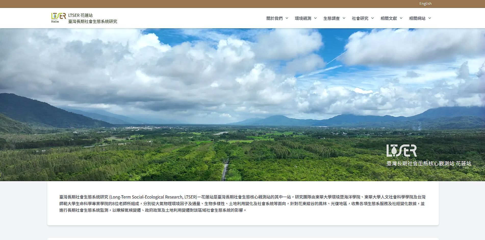 | 5 | ![]() | 網站名稱 臺灣長期社會生態核心觀測站 花蓮站 網址 https://www.ltsertw-hualien.org/tw 網站簡介 臺灣長期社會生態系統研究 (Long-Term Social-Ecological Research, LTSER)-花蓮站是臺灣長期社會生態核心觀測站的其中一站,研究團隊由東華大學環境暨海洋學院、東華大學人文社會科學學院及台灣師範大學生命科學專業學院的8位老師所組成,分別從大氣物理環境因子及通量、生物多樣性、土地利用變化及社會系統等面向,針對花東縱谷的鳳林、光復地區,收集各項生態系服務及社經變化數據,並進行長期社會生態系統監測,以暸解氣候變遷、政府政策及土地利用變遷對該區域社會生態系統的影響。 | 陳泓穎 | 2025/9/5 下午 04:18:02 |