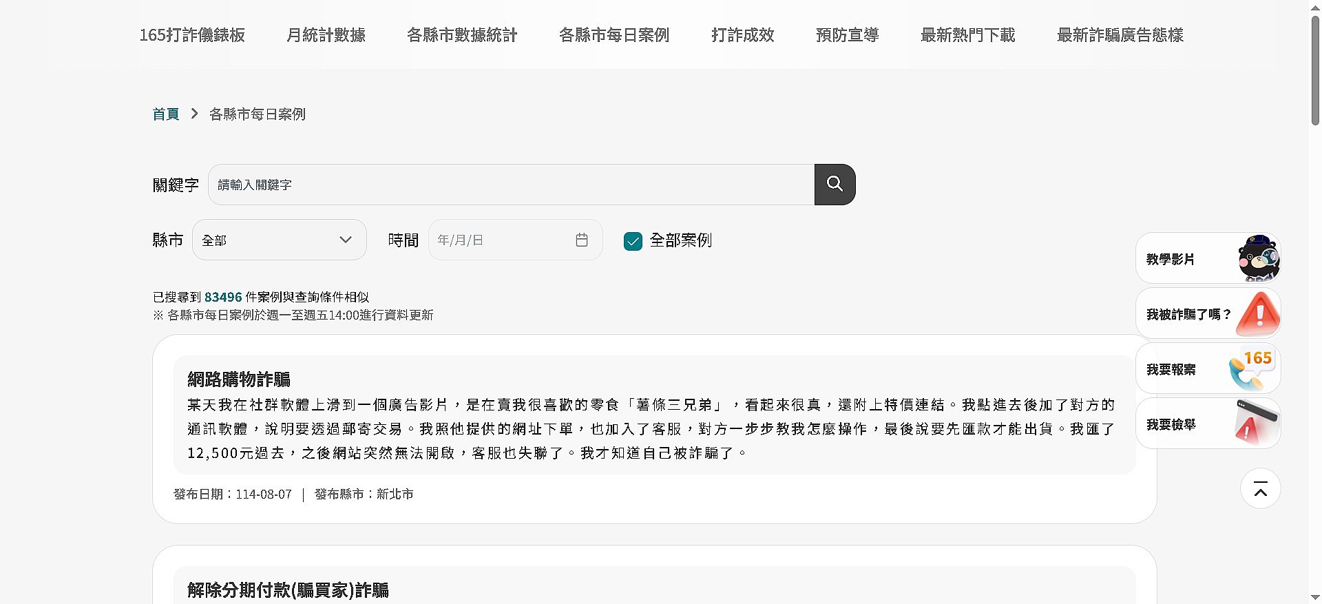 | 1 | ![]() | 作者 內政部警政署 來源 https://165dashboard.tw/ 描述 根據內政部警政署提供的資料,了解花蓮地區常見的詐騙手法與金額損失。 | 許芷寧 | 2025/8/10 下午 10:25:03 |