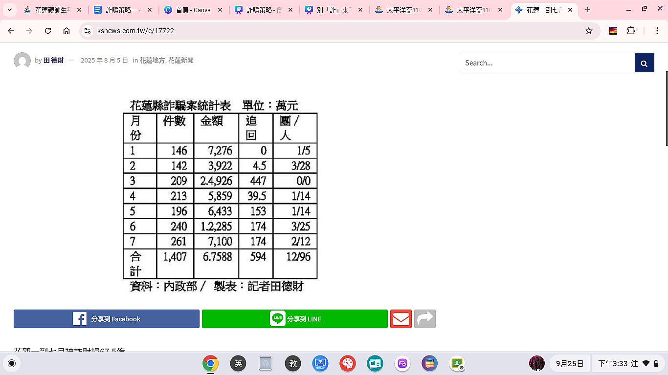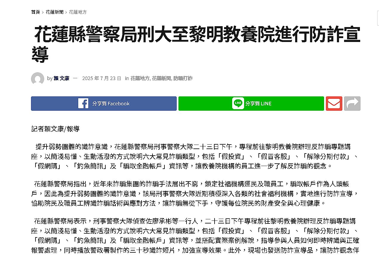 | 3 | ![]() | 網站名稱 更生日報 網址 https://www.ksnews.com.tw/e/17722 網站簡介 內政部最新統計花蓮今年一到七月,詐騙案被詐財損金額達到六點七六億元,其中三月被詐二點四九億元為最高,六月一點二億元;七月被詐件數有二百六十一件,以每十萬人口比例為八十二件,全國最第二高。上列數據顯示花蓮縣的詐騙案的嚴重性。 | 楊賴心妤 | 2025/9/25 下午 03:40:18 |