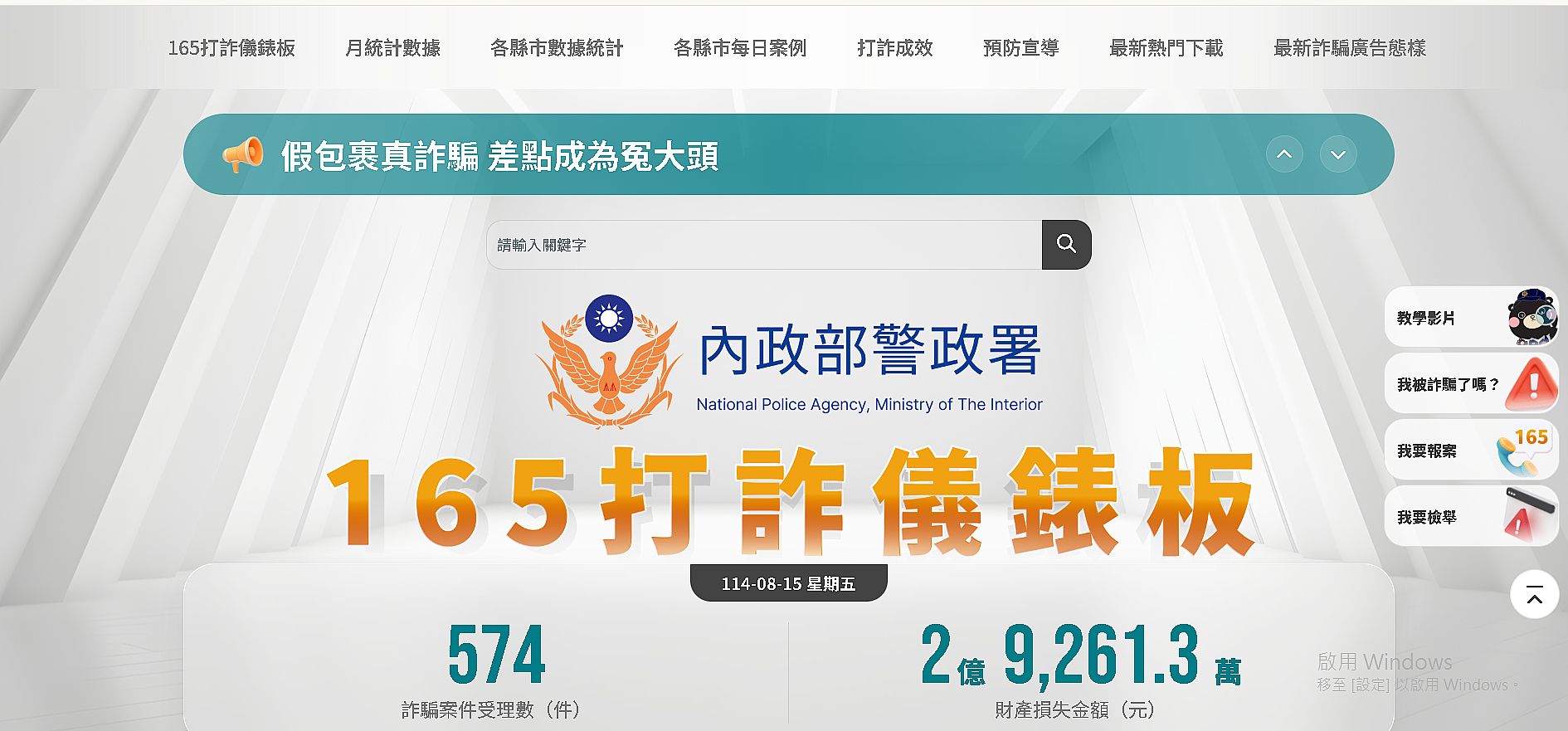 | 1 | ![]() | 網站名稱 內政部警政署165打詐儀表板 網址 https://165dashboard.tw/ 網站簡介 透過這個網站可以讓我們知道花蓮地區的受騙資訊 | 許芷寧 | 2025/8/16 下午 11:13:13 |