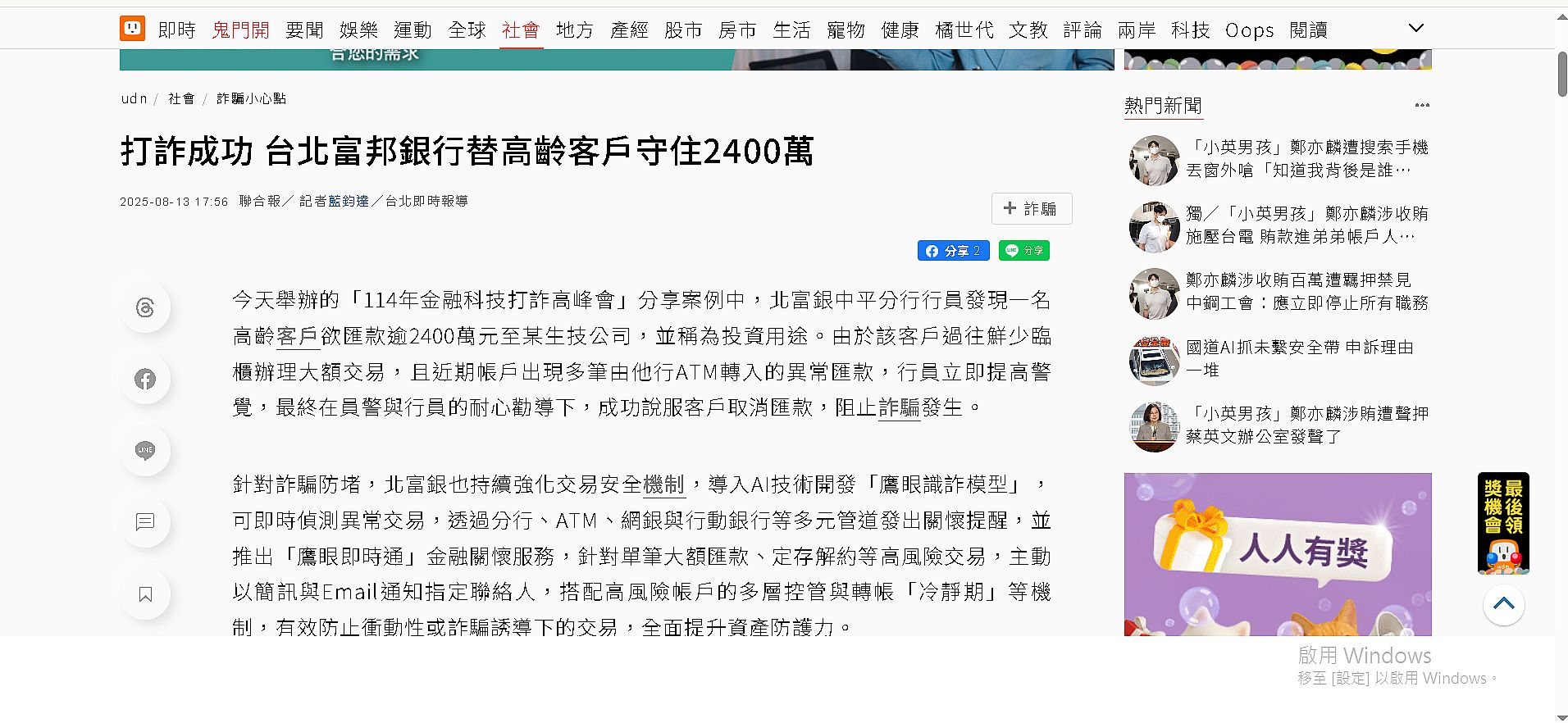 | 2 | ![]() | 網站名稱 聯合新聞網 網址 https://udn.com/news/story/124490/8937379?utm_source=line&utm_campaign=lineweb&utm_medium=share 網站簡介 這則新聞讓我們知道有些詐騙還是可以在第一時間被阻止 | 許芷寧 | 2025/8/27 下午 05:40:31 |