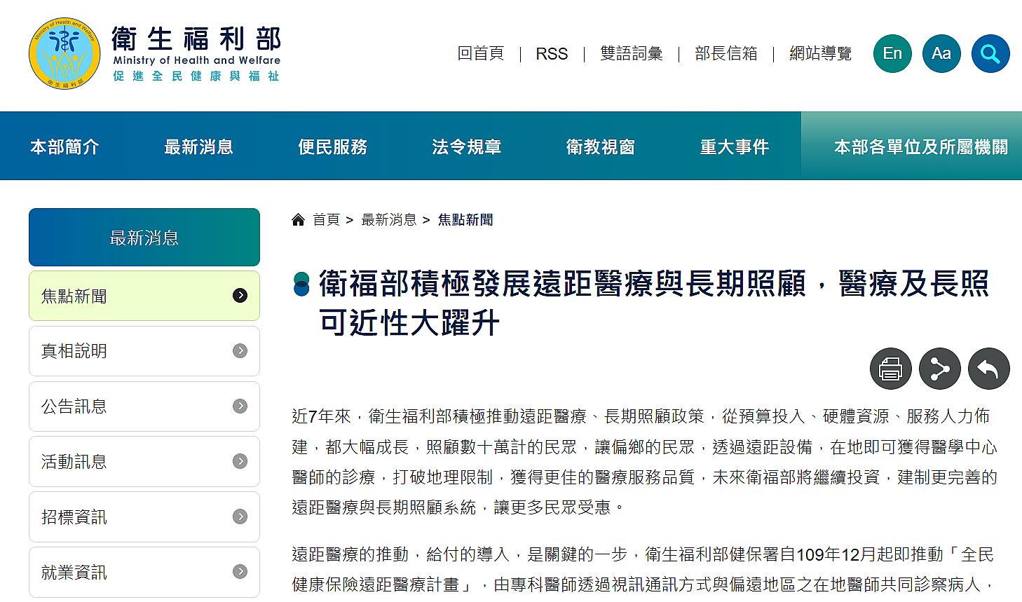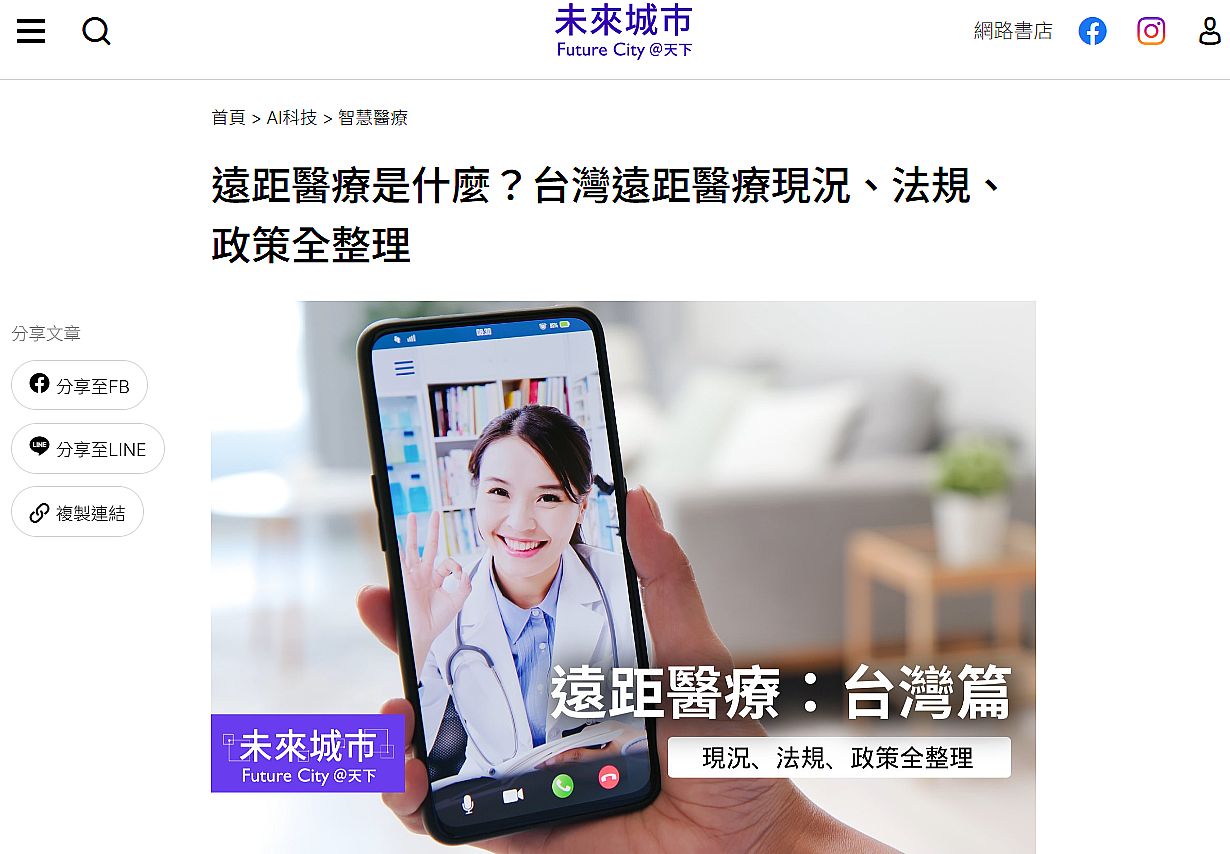 | 5 | ![]() | 網站名稱 遠距醫療是什麼?台灣遠距醫療現況、法規、政策全整理 - 未來城市@天下 - 進步城市的新想像 網址 https://futurecity.cw.com.tw/article/2500 網站簡介 本篇文章由《天下雜誌》旗下的未來城市平台撰寫,全面整理台灣遠距醫療的發展現況與制度演進。內容涵蓋遠距醫療的定義、應用情境、法規限制、政策推動進程及未來挑戰,並點出疫情如何加速醫療數位轉型,是深入理解台灣遠距醫療制度與發展脈絡的重要參考。 | 趙以愛 | 2025/8/9 下午 02:05:42 |