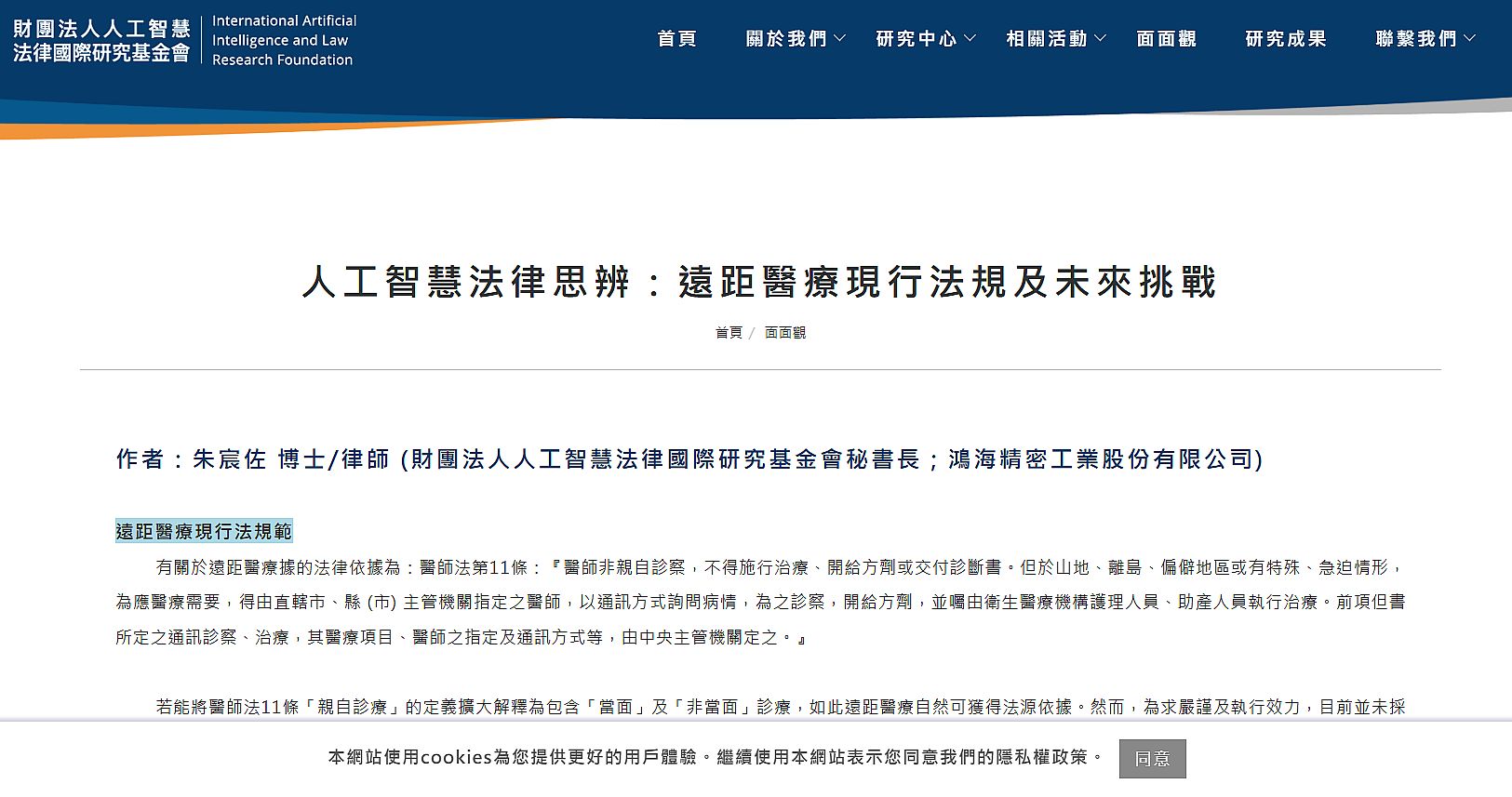 | 3 | ![]() | 網站名稱 遠距醫療現行法規及未來挑戰 | 財團法人人工智慧法律國際研究基金會 網址 https://intlailaw.org/article_d.php?lang=tw&tb=4&id=1696 網站簡介 這篇文章由財團法人人工智慧法律國際研究基金會所發表,整理了台灣目前遠距醫療的法規依據與未來挑戰。它從醫師法第11條與《通訊診察治療辦法》的條文出發,說明遠距醫療在山地、離島、偏鄉的合法推行範圍,也分析疫情後政策放寬、健保給付等制度變化。文章兼具法條解說與實務觀察,適合研究者理解遠距醫療的制度框架與潛在發展機會。 | 趙以愛 | 2025/8/9 下午 02:02:14 |