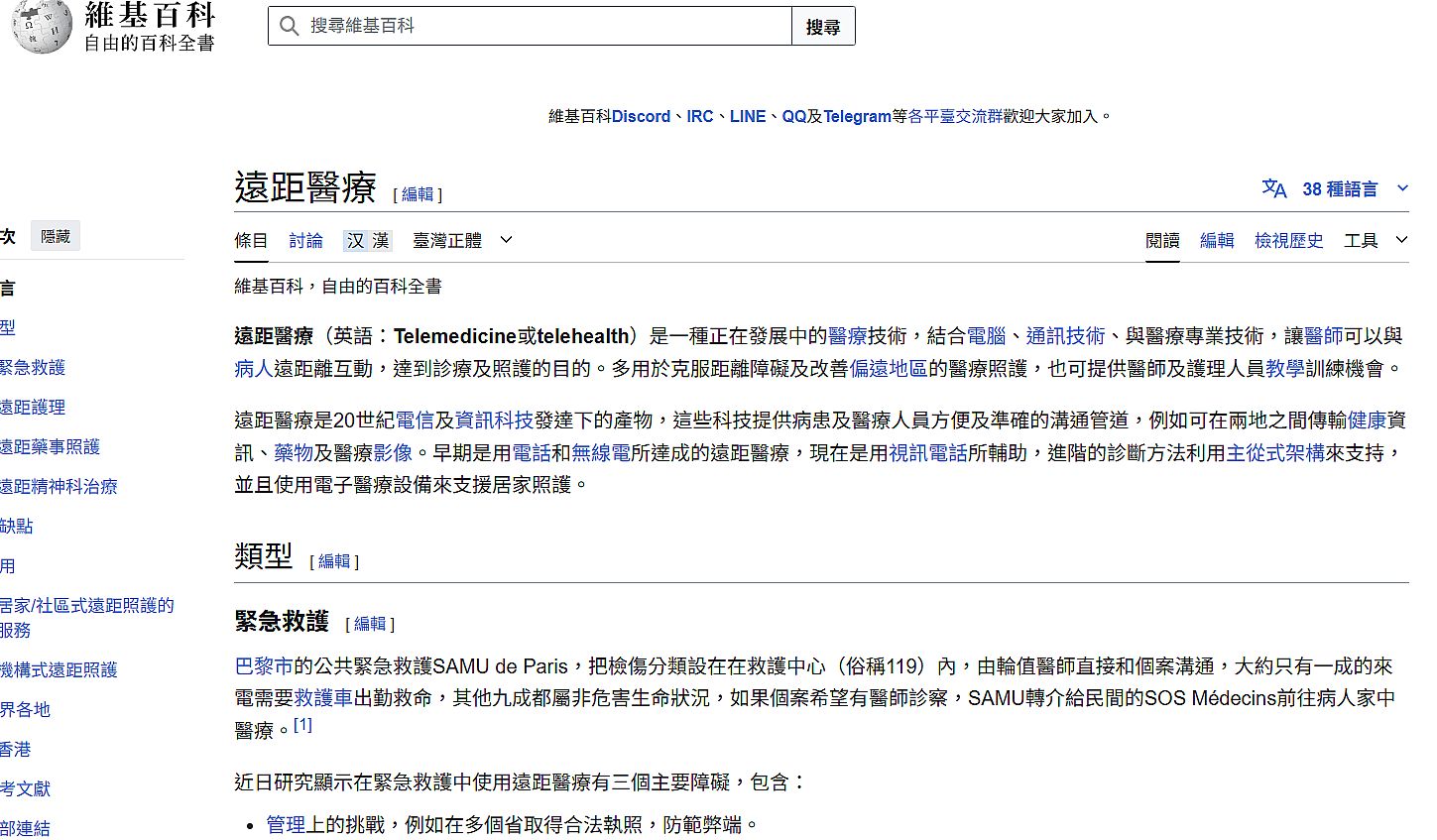 | 4 | ![]() | 網站名稱 遠距醫療 - 維基百科,自由的百科全書 網址 https://zh.wikipedia.org/zh-tw/%E9%81%A0%E8%B7%9D%E9%86%AB%E7%99%82 網站簡介 本頁介紹「遠距醫療」(Telemedicine)的定義、歷史沿革、技術應用、分類方式及全球發展現況。內容涵蓋視訊診療、遙控手術、慢性病遠距管理等模式,並說明遠距醫療在提升偏鄉醫療可近性、疫情期間的應用價值,以及所面臨的法規、隱私與技術挑戰。條目兼具科學與政策觀點,是了解遠距醫療全貌的實用入門資源。 | 趙以愛 | 2025/8/9 下午 02:04:58 |