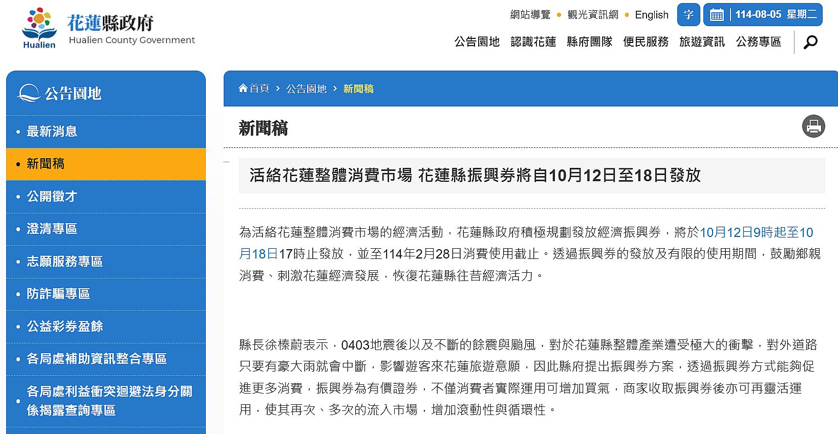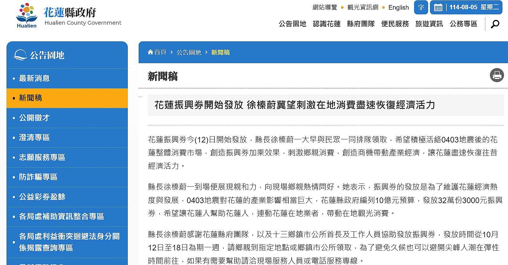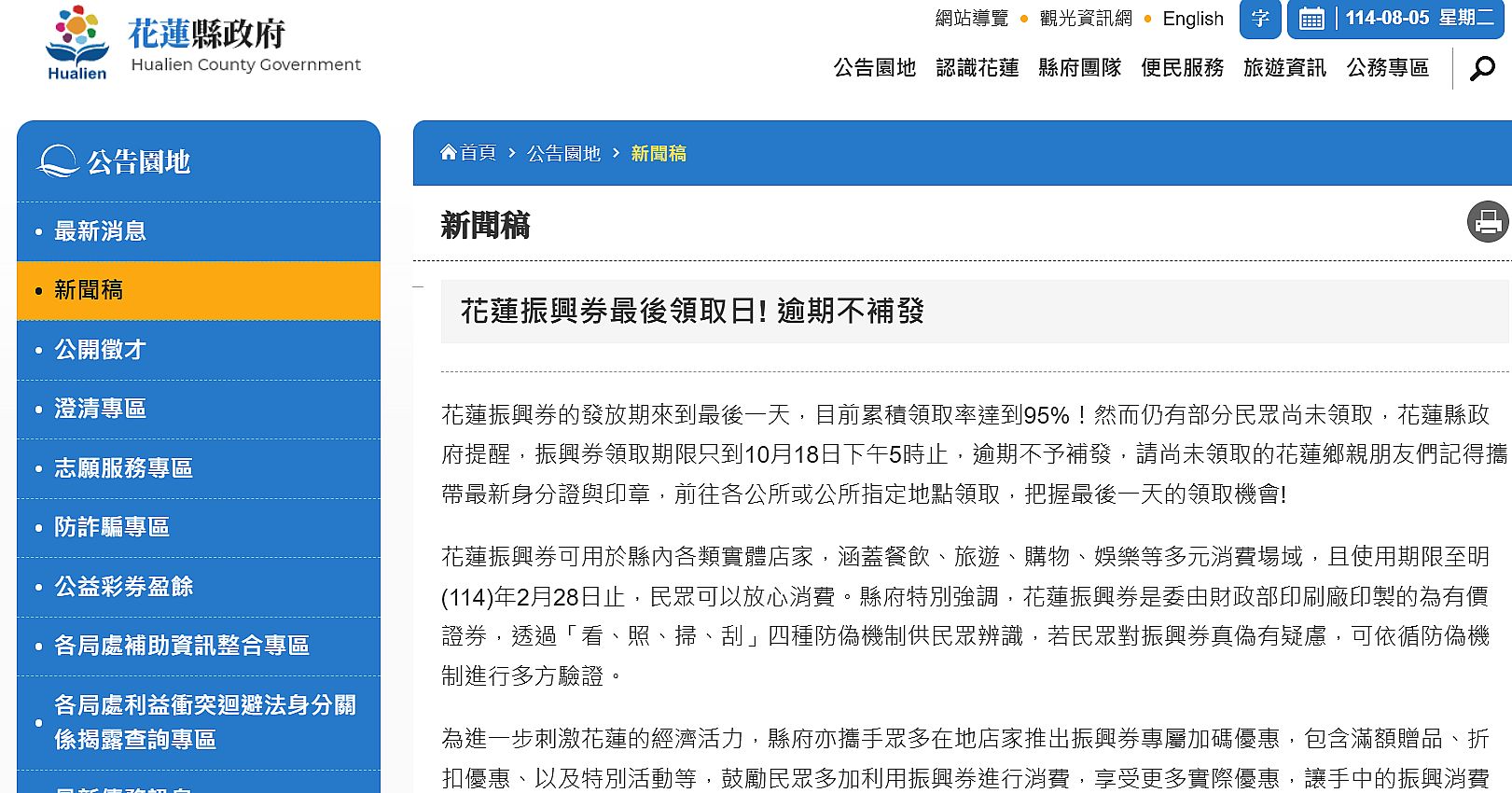 | 3 | ![]() | 網站名稱 花蓮縣政府全球資訊網 — 振興券計畫啟動 網址 https://www.hl.gov.tw/News_Content.aspx?n=32725&s=166384 網站簡介 公布花蓮縣政府振興計畫啟動及3000元加碼券發放流程,包括領取方式、領取地點與操作規範,展現地方政府鼓勵民眾消費的政策設計。 | 呂簡林 | 2025/8/10 上午 09:23:07 |