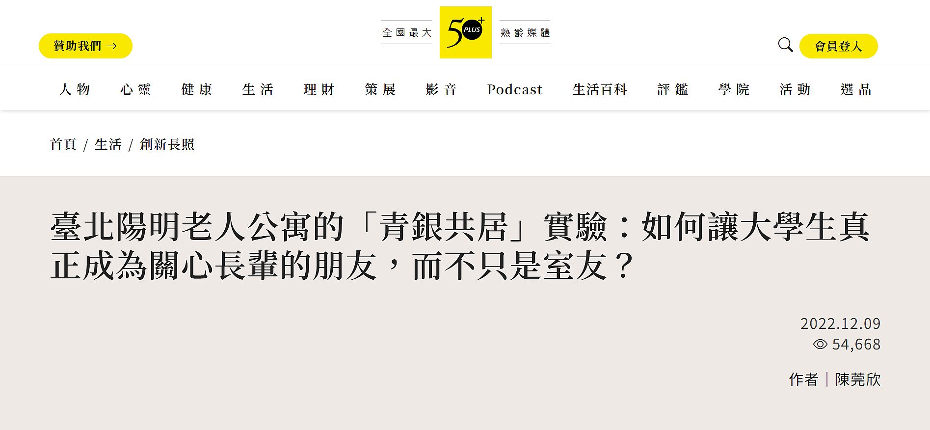 | 1 | ![]() | 網站名稱 青銀共居實驗 網址 https://www.fiftyplus.com.tw/articles/26128 網站簡介 「青銀共居」 是一種創新的生活模式,強調世代合作與情感連結。若有良好的配對機制與生活規則,能成為雙方都受益的方案。然而,必須重視彼此需求與界線,建立有效溝通與支持系統,才能讓共居關係穩定而有意義。 | 簡彤 | 2025/8/19 上午 08:26:15 |