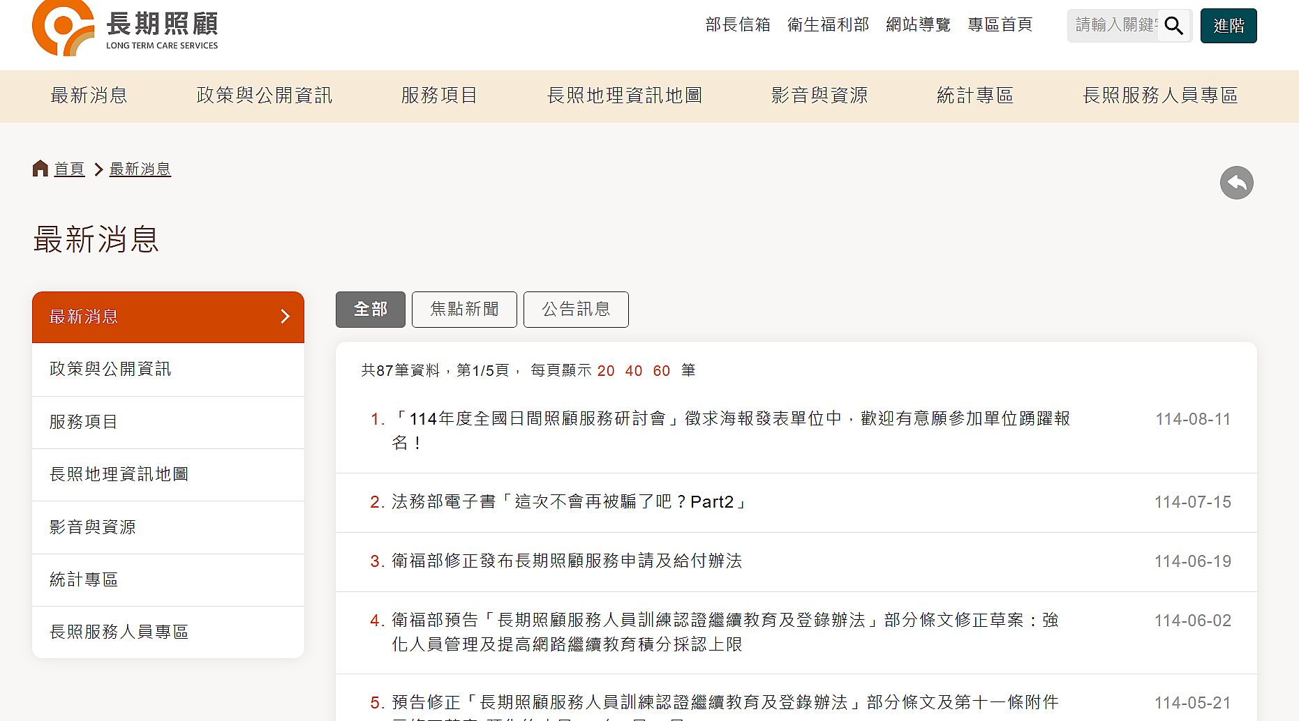 | 2 | ![]() | 網站名稱 衛福部長照專區 網址 https://1966.gov.tw/LTC/lp-6440-207.html 網站簡介 提供長照相關的資訊與服務,像交通接送服務和輔具租借服務 | 蕭茗真 | 2025/8/19 上午 08:42:29 |