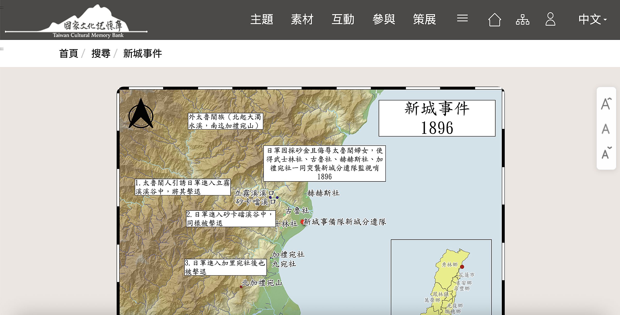 | 1 | ![]() | 網站名稱 國家文化記憶庫 網址 https://tcmb.culture.tw/zh-tw/detail?keyword=新城事件&searchMode=Precise&languageMode=Transfer&limit=24&offset=0&sort=relevance&order=desc&isFuzzyMode=false&query=%7B%7D&indexCode=Culture_Object&id=601459&recOffset=2 網站簡介 國家文化記憶庫(Taiwan Cultural Memory Bank, TCMB) 是由中華民國文化部建置的數位文化平台,旨在透過科技手段保存與傳播臺灣的文化資源。該平台以「讓歷史走入日常、讓全民共創記憶」為核心理念,蒐集並整理影像、文獻、聲音、故事等多樣化的原生內容,並提供檢索、主題展覽、創作應用及社群參與等功能。這不僅讓使用者能更便利地接觸臺灣的文化記憶,也讓文化資源能夠被活化、再利用,延伸至日常生活之中。 國家文化記憶庫不只是典藏資料的工具,更是一個全民共享與參與的文化平臺。透過全民的投入,文化記憶不再只是靜態的保存,而能不斷被補充、延伸與再創造。這種模式使文化保存的責任由官方走向全民,促使更多人能夠以自身的生活經驗參與其中,強化社會對文化的認同感與凝聚力。 同時,TCMB 也肩負將臺灣文化推向國際的使命。透過數位交流與跨國共享,臺灣的多元文化樣貌得以在世界舞台上被看見。總體而言,國家文化記憶庫是一個融合科技與文化的平台,不僅保存與推廣臺灣文化,更透過全民參與,共同建構出更豐富多元且具國際影響力的文化未來。 | 江泊葦 | 2025/8/27 上午 10:34:53 |
