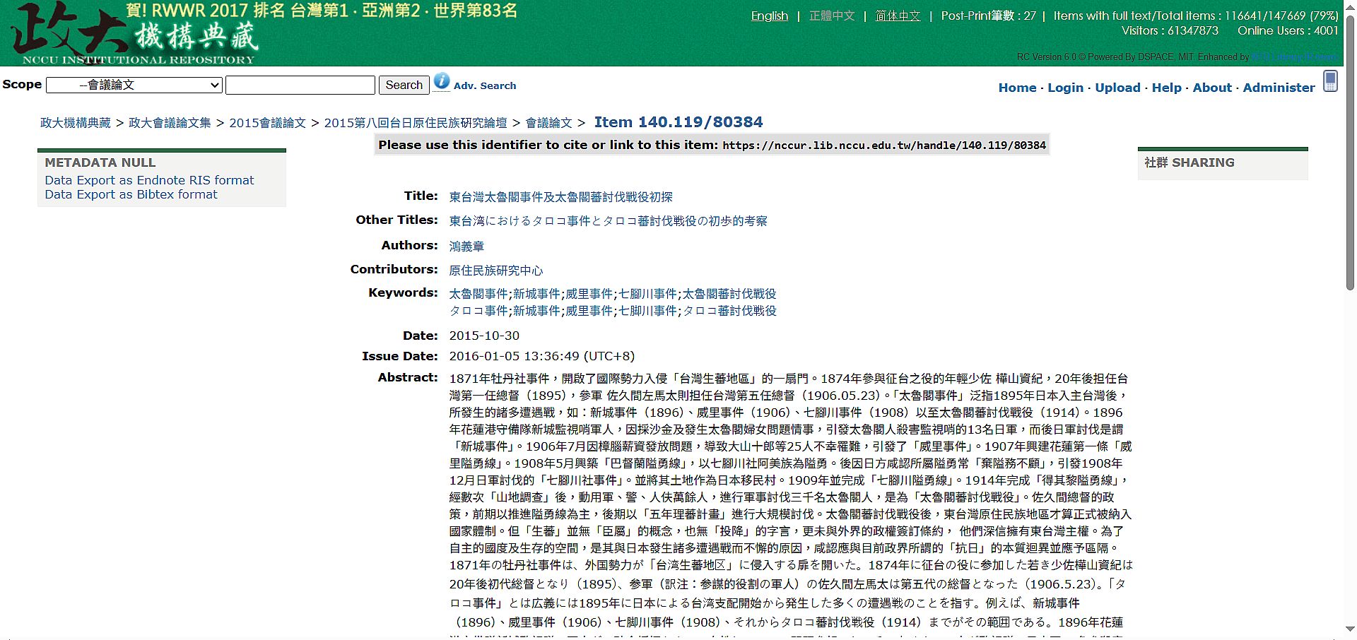 | 4 | ![]() | 網站名稱 政大機構典藏 網址 https://nccur.lib.nccu.edu.tw/handle/140.119/80384 網站簡介 政大機構典藏(NDCC,National Chengchi University Institutional Repository)是國立政治大學建置的數位典藏平台,主要蒐集、保存與分享校內師生及研究單位的學術成果。典藏內容包含學位論文、期刊文章、研究報告、會議論文等,並提供公開查詢與下載服務。此平台旨在推動知識保存與開放存取,促進學術交流與研究價值的傳播,成為校內外研究者取得與共享學術資源的重要管道。 | 鄭帛玲 | 2025/8/31 下午 09:07:07 |