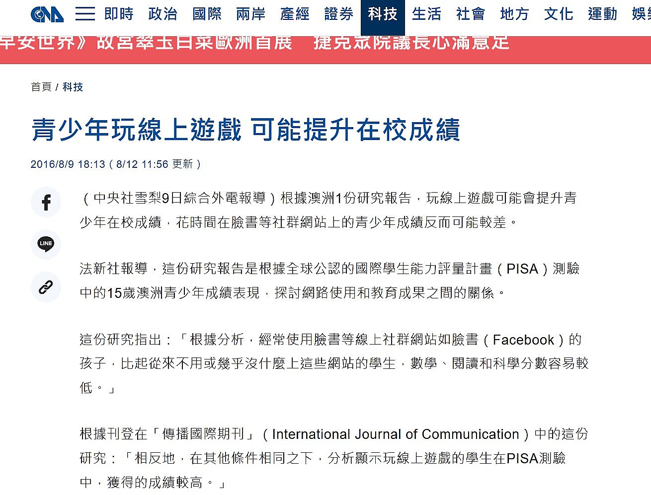 | 1 | ![]() | 網站名稱 中央社一手新聞 網址 https://www.cna.com.tw/news/ait/201608090393.aspx 網站簡介 網站簡介:根據澳洲1份研究報告,玩線上遊戲可能會提升青少年在校成績,花時間在臉書等社群網站上的青少年成績反而可能較差 | 姜品瑜 | 2025/9/13 上午 08:45:16 |