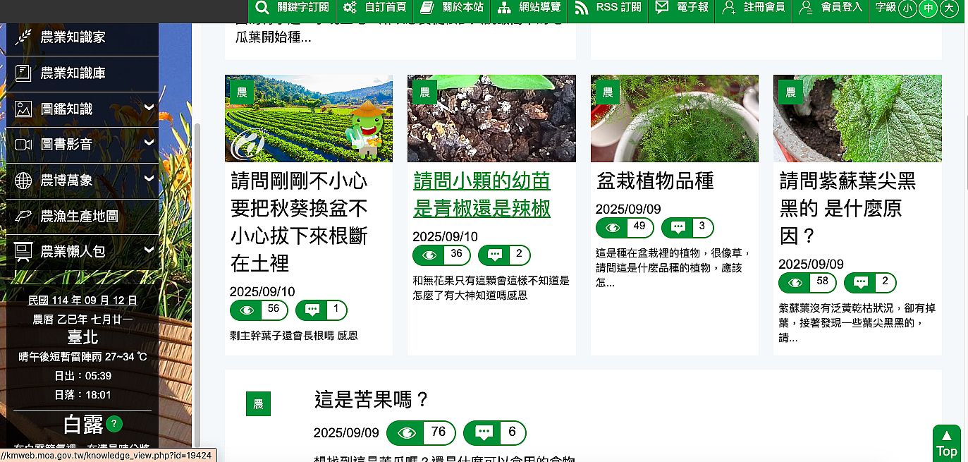 | 1 | ![]() | 網站名稱 農業知識入口網 網址 https://kmweb.moa.gov.tw/ 網站簡介 網站有豐富的植物圖鑑,我們可以查閱在文獻提及的植物,還能在網站中以關鍵字搜尋我們想查找的植物病蟲害資訊。也能在農業知識家的欄位中看到各種發問,讓我們可以了解別人在種植植物時遇到的疑難雜症。 | 楊詠甯 | 2025/9/12 上午 12:47:11 |