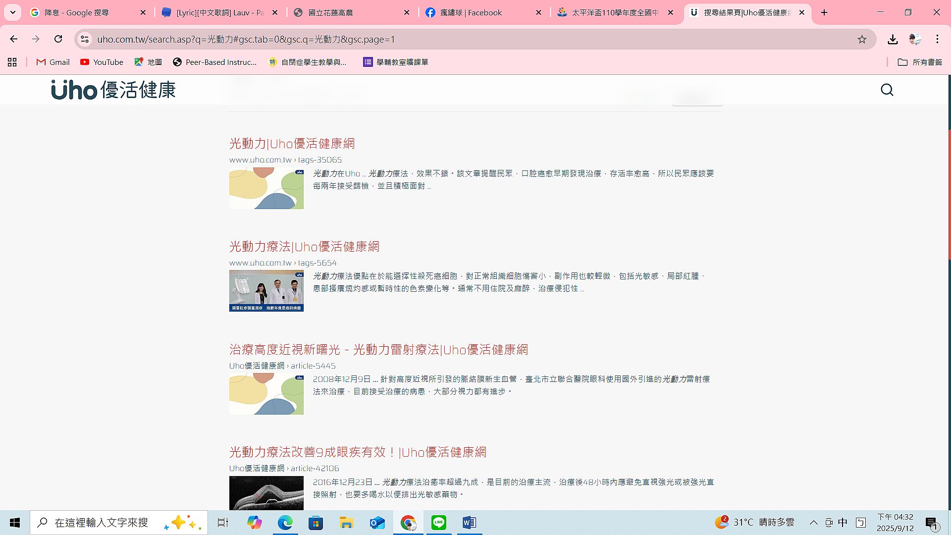 | 3 | ![]() | 網站名稱 優活健康網 網址 https://www.uho.com.tw/index.asp 網站簡介 《優活健康網》是關注健康和生活議題型媒體,內容整合醫學專業、自然生活、人際生活,乃至心靈健康等相關文章,提供讀者正確的健康知識。因為我門的研究主題與光動力療法有關,此療法運用在人體已有大量的研究和報導,在這個網站搜尋關鍵字:光動力,就能看到各式各樣與光動力療法有關的資訊,有助於我們認識光動力療法。 | 盧政佑 | 2025/9/12 下午 04:34:24 |