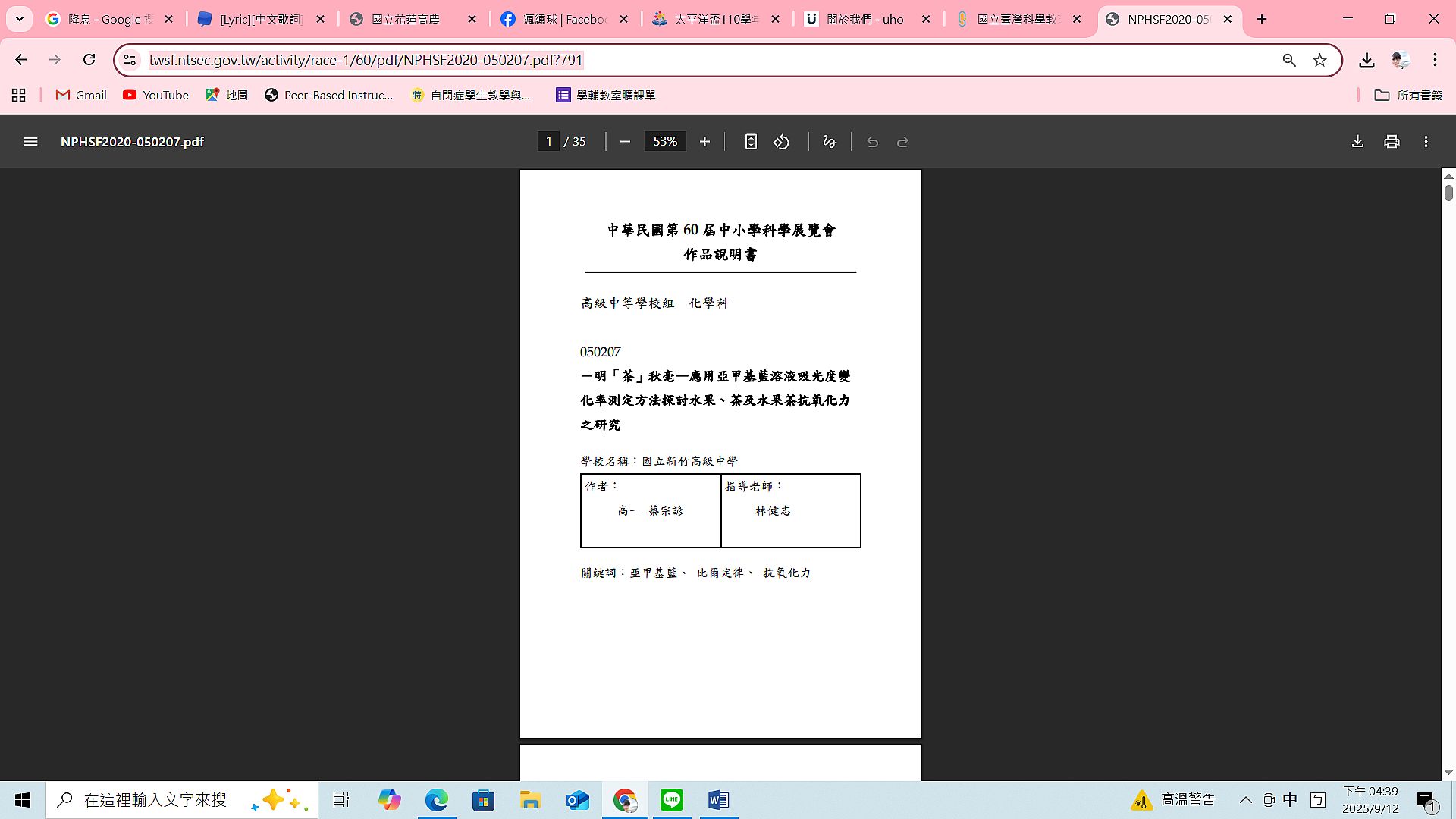 | 4 | ![]() | 網站名稱 明「茶」秋毫—應用亞甲基藍溶液吸光度變 化率測定方法探討水果、茶及水果茶抗氧化力 之研究 網址 https://twsf.ntsec.gov.tw/activity-1/60/pdf/NPHSF2020-050207.pdf?791 網站簡介 我們在國立台灣科學教育館網站的科展資訊系統內搜尋相關研究,網站有每個年度的科展作品說明書。我們發現這篇研究與我們的研究相關,篇名是:明「茶」秋毫—應用亞甲基藍溶液吸光度變 化率測定方法探討水果、茶及水果茶抗氧化力之研究。 | 蔡鎬謙 | 2025/9/12 下午 04:44:25 |