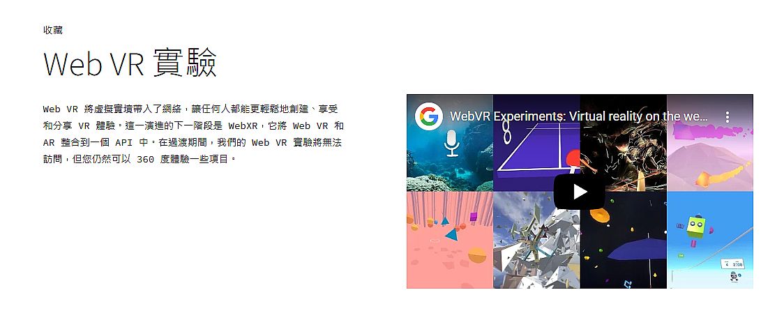 | 5 | ![]() | 網站名稱 Google Web VR Experiments — 多個可以在網頁上體驗的 VR 實驗項目 網址 https://experiments.withgoogle.com/collection/webvr?utm_source=chatgpt.com 網站簡介 Web VR 將虛擬實境帶入了網絡,讓任何人都能更輕鬆地創建、享受和分享 VR 體驗。這一演進的下一階段是 WebXR,它將 Web VR 和 AR 整合到一個 API 中。在過渡期間,我們的 Web VR 實驗將無法訪問,但您仍然可以 360 度體驗一些項目。 | 吳家馨 | 2025/9/24 下午 04:06:13 |