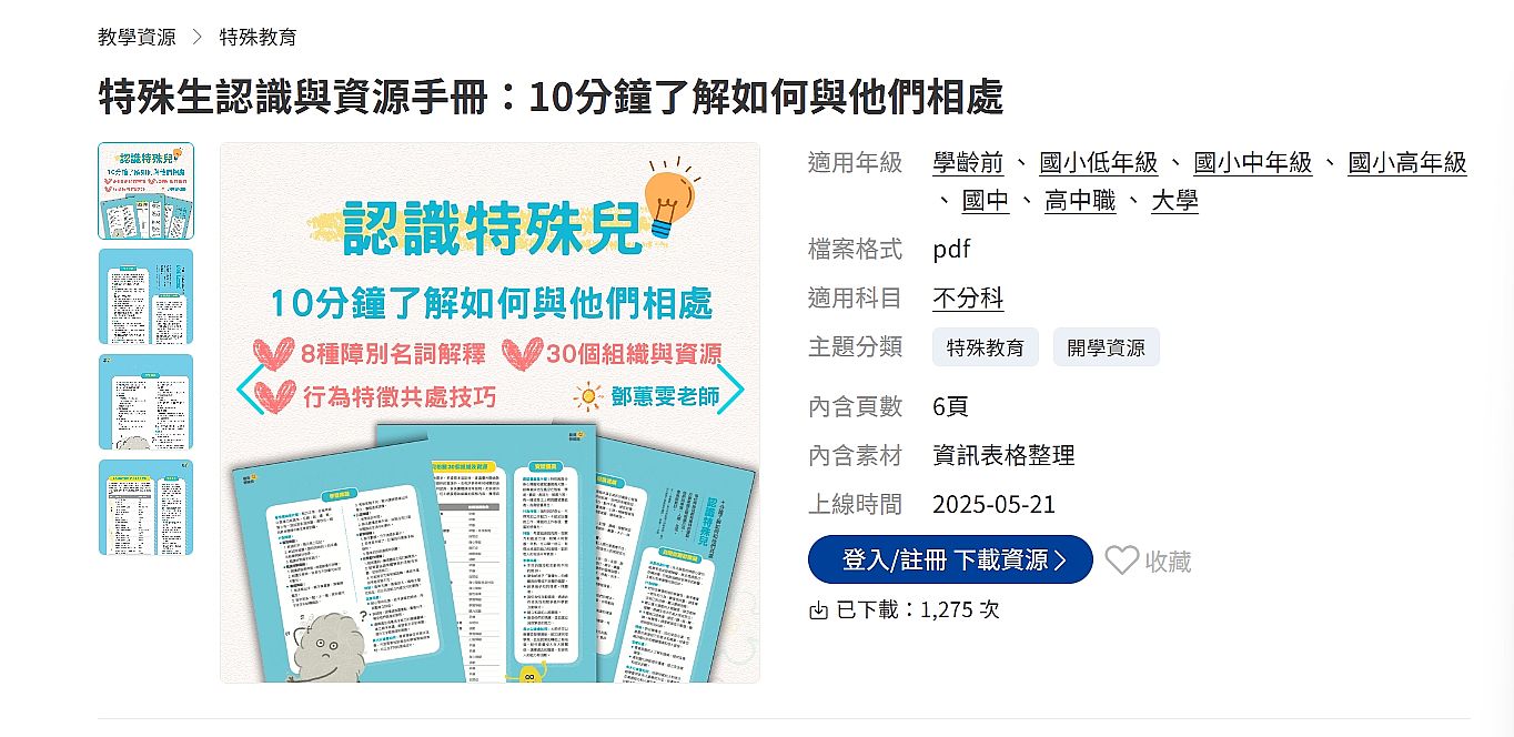 | 2 | ![]() | 網站名稱 特殊生認識與資源手冊:10分鐘了解如何與他們相處 - 翻轉教育 網址 https://flipedu.parenting.com.tw/teacher_resource/519 網站簡介 這本手冊其實是給大人看的,而正好我跟小組員們一起在查資料時看到的,當時老師在旁邊就發現這本書其實他看過,而且我們老師剛好就是特教老師,他常常會看這個網站的資料、有時候他也會趁機推薦一些特教相關的繪本給我們帶回教室去分享給同學們看,從冠傑老師說出來的這本書的內容,大概就是從特殊生的行為模式去衍生相處方法,雖然聽起來不容易,但就是不容易才需要去做不是嗎! | 陳忻愉 | 2025/9/30 下午 08:43:35 |