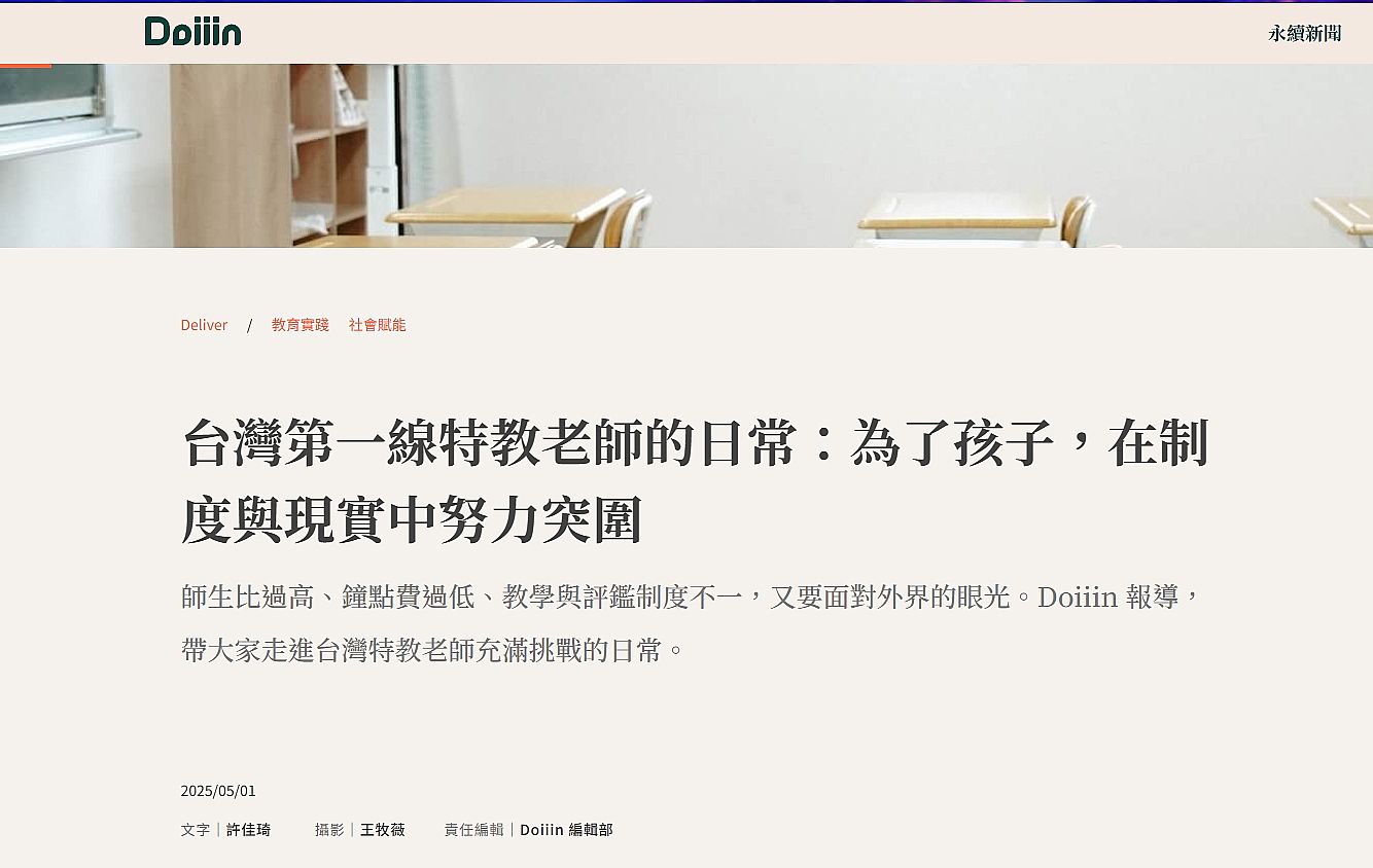 | 4 | ![]() | 網站名稱 台灣第一線特教老師的日常:為了孩子,在制度與現實中努力突圍 網址 https://doiiin.org/special-education-teachers-challenges-taiwan 網站簡介 我看到沛螢跟忻愉找的資料好像都很支持融合教育這個制度,可是我看到冠傑老師有時候在幫學生上課時也是會露出很多無奈的表情,於是我剛好趁找到這個網站的機會,裡面的角度都是從特教老師、心理師的角度出發,讓我們能夠了解原來第一線的人員都在想什麼,還有為什麼融合教育會被認為是天方夜譚,在看完這個網站以後我能夠稍微知道老師們的難處,因為我自己也是在資源班上課的學生,裡面很多的事情就跟我在上課時一樣常常會看到、發生。 | 劉俊翊 | 2025/9/30 下午 09:01:37 |