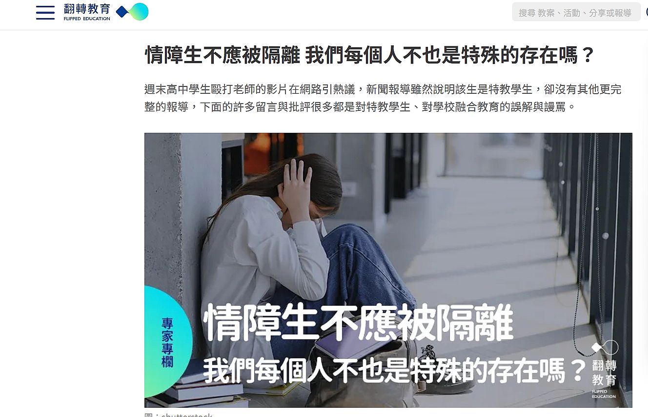 | 5 | ![]() | 網站名稱 情障生不應被隔離 我們每個人不也是特殊的存在嗎?-翻轉教育 網址 https://flipedu.parenting.com.tw/article/009056 網站簡介 網站裡面有說到之前很大的新聞,有一個高中的特教學生打老師,我覺得很不應該,也有很多人因為這件事對融合教育感到不信任、批評這個方向是錯誤的,他們應該被丟到特教班去,可是網站提到融合教育就是要讓這些同學們跟我一樣有權利待在教室內一起上課,不應該出現隔離的事情才對。 對於情緒障礙的同學,應該給予更多的配套措施,而不是一出現問題就馬上讓她隔離,期盼大家可以有更多的同理心去對待這些同學。 | 劉俊翊 | 2025/9/30 下午 09:05:49 |