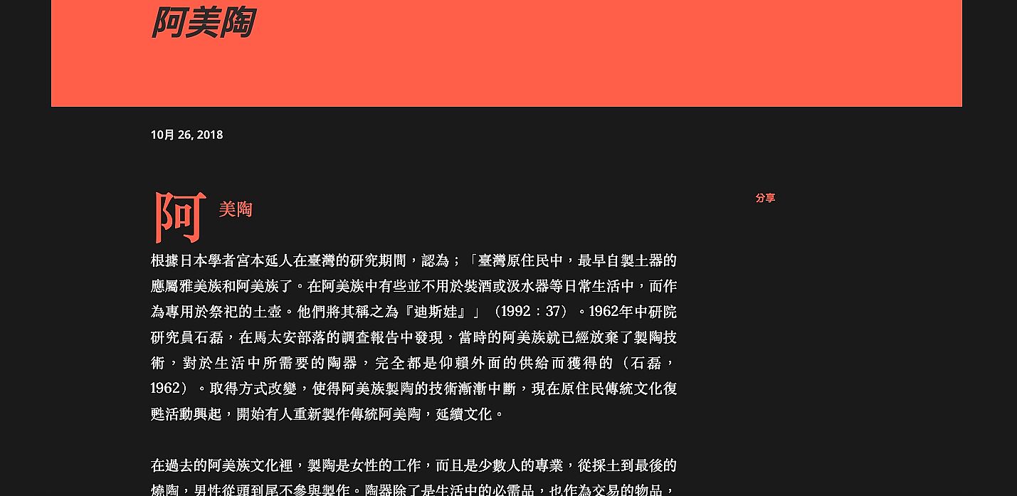| 4 | 作者 林禹佟 標題 台灣原住民的生活器具 內容 看完這篇文章,我學到了好多新知識!原來阿美族有兩樣很特別的陶器,分別叫做 Tatoronan 和 Diwas。Tatoronan 是一種用來蒸煮食物的器具,裡面可以放芋頭、米、小米或其他穀物,蒸熟後就能吃到香香熱熱的料理,光想就覺得很好吃。Diwas 則是男生在祭祀祖靈時使用的祭杯,用它來盛酒或飲料,代表對祖先的尊敬和感謝。文章還告訴我,這些陶器不只是普通的東西,它們和家族的傳統、祭典、生活都有很大的關係。以前的人會很用心地把陶器做得又漂亮又實用,因為它們是生活中重要的幫手,也能傳達對祖先的情感。 | 林禹佟 | 2025/9/18 下午 02:34:37 |