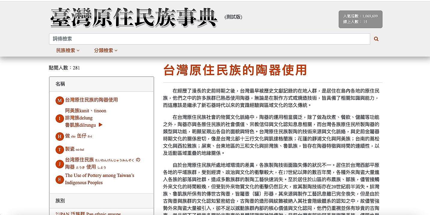 | 3 | ![]() | 網站名稱 穿越時空之旅 – 臺灣史前陶與原住民族陶 網址 https://openmuseum.tw/muse/exhibition/30bd91eb9fd95f2c37b0570301d14bd5 網站簡介 ・陶是時空旅行者 陶器自新石器時代起,承擔日常與儀式功能,從史前到當代持續演變。本展以「穿越時空之旅」為主題,展現臺灣史前、原住民族及當代陶藝的發展。 ・史前陶 約6000年前起源於大坌坑文化,特徵為手製不拉坯、低溫燒製、夾砂或泥質、色澤多為橙紅與灰黑。用途分日常生活與儀式陪葬兩大類,器型與紋飾依地區與需求各異。 ・原住民族陶器 多承襲史前陶特徵,但各族群技術與意義不同。17世紀後外來器物影響,僅阿美族、達悟族仍保有傳統製陶技術。 *阿美族:以炊煮與祭祀陶為主。 *達悟族:器型多樣,另有陶偶與冶煉坩鍋。 *排灣、魯凱族:製陶失傳,但陶壺成為祭祀、婚嫁重要器物。 *平埔族(西拉雅):以外來容器供奉阿立祖祖靈信仰。 ・當代陶藝 20世紀末原住民族文化復振,藝術家再現並突破傳統技術,陶藝作品展現新的想像與發展。 | 王妤倫 | 2025/9/18 下午 03:54:09 |