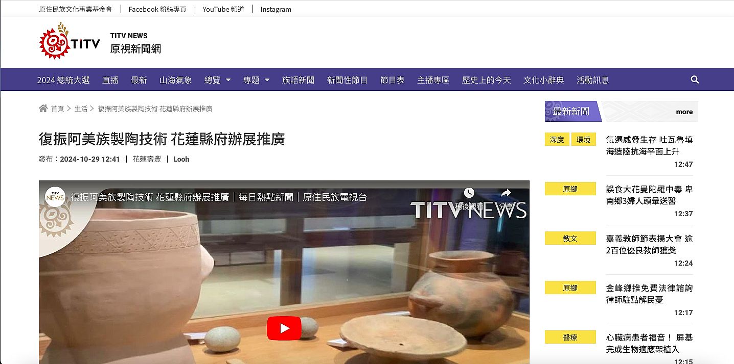 | 4 | ![]() | 網站名稱 復振阿美族製陶技術 花蓮縣府辦展推廣 網址 https://news.ipcf.org.tw/143683?utm_source=chatgpt.com 網站簡介 花蓮縣文化局於考古博物館展出阿美陶,從史前陶器對照當代柴燒與電窯製作,凸顯阿美陶復振的重要性。 工藝家與創作者強調,製陶不僅是技藝,更是族人記憶與文化根源。年輕人透過學習製陶,能理解祖先的生活形態,並開展多元創作。 阿美陶過去以太巴塱與水璉部落為中心,因當地陶土資源而盛行,成品常與周邊部落交易。如今工藝師持續延續祖輩的柴燒精神,即使改用電窯,仍堅守文化傳承。 製陶文化源於先祖日常,並與祭祀、季節緊密相連,展現對自然與神靈的敬畏,也提醒人們阿美陶並非過去的遺跡,而是當下生活仍在延續的文化力量。 | 蔡昀恩 | 2025/9/18 下午 08:06:38 |