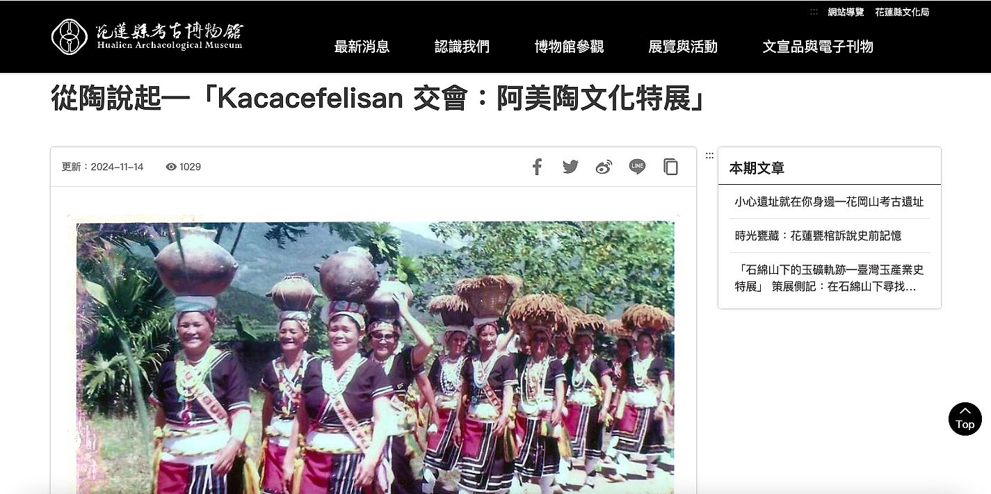 | 5 | ![]() | 網站名稱 從陶說起—「Kacacefelisan 交會:阿美陶文化特展」 網址 http://hlam.hccc.gov.tw/zh-tw/epaper/detail/4 網站簡介 阿美陶是阿美族的重要器具,不僅用於日常生活與祭祀,也是連結史前文化與現代族群的橋樑。從史前靜浦文化到近代部落,再到今日的復振行動,阿美陶見證了文化的延續與變動。製陶有嚴謹規範,如固定季節、女性製作、祭祀儀式與環境保護,展現了敬畏自然與自足精神。雖然曾因工業製品衝擊而式微,但如今部落陶師積極復振,使信仰與生活再次緊密相連。本次展覽透過「史前」、「製作」、「傳統」、「當代」四大面向,展現阿美陶跨越時空、融合文化的多樣風貌。 | 葉昊宇 | 2025/9/18 下午 08:35:58 |