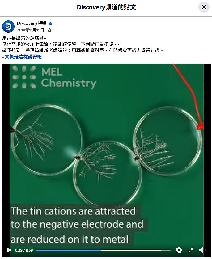 | 1 | ![]() | 網站名稱 用電長出來的錫結晶~ 氯化亞錫溶液加上電流,還能順便學一下判斷正負極呢~~ 讓我想到上禮拜孫維新老師講的:用藝術推廣科學,有時候會更讓人覺得有趣。 網址 https://www.facebook.com/discoverytw/posts/%E7%94%A8%E9%9B%BB%E9%95%B7%E5%87%BA%E4%BE%86%E7%9A%84%E9%8C%AB%E7%B5%90%E6%99%B6%E6%B0%AF%E5%8C%96%E4%BA%9E%E9%8C%AB%E6%BA%B6%E6%B6%B2%E5%8A%A0%E4%B8%8A%E9%9B%BB%E6%B5%81%E9%82%84%E8%83%BD%E9%A0%86%E4%BE%BF 網站簡介 用電長出來的錫結晶~,「錫」的結晶也太美了! | 蔡皓昕 | 2025/9/12 下午 01:09:24 |