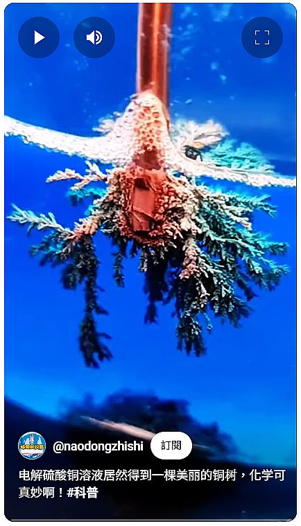| 2 | ![]() | 網站名稱 電解硫酸銅溶液居然得到一棵美麗的銅樹,化學可真妙啊! 網址 https://www.youtube.com/shorts/-B0cr8LqJ0c 網站簡介 調配五水合硫酸銅溶液並接上電極,就會在負極產生反應,便能看到美麗的金屬樹(銅樹) | 蔡皓昕 | 2025/9/15 下午 06:38:05 |