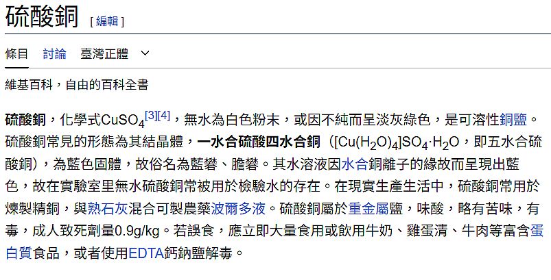 | 3 | ![]() | 網站名稱 硫酸銅-維基百科,自由的百科全書 網址 https://zh.wikipedia.org/wiki/%E7%A1%AB%E9%85%B8%E9%93%9C 網站簡介 這個網站裡有硫酸銅的基本介紹,包括它的特性、製備方式及化學性質等,能讓我們完善的了解硫酸銅。 | 江有邦 | 2025/9/15 下午 06:42:01 |
