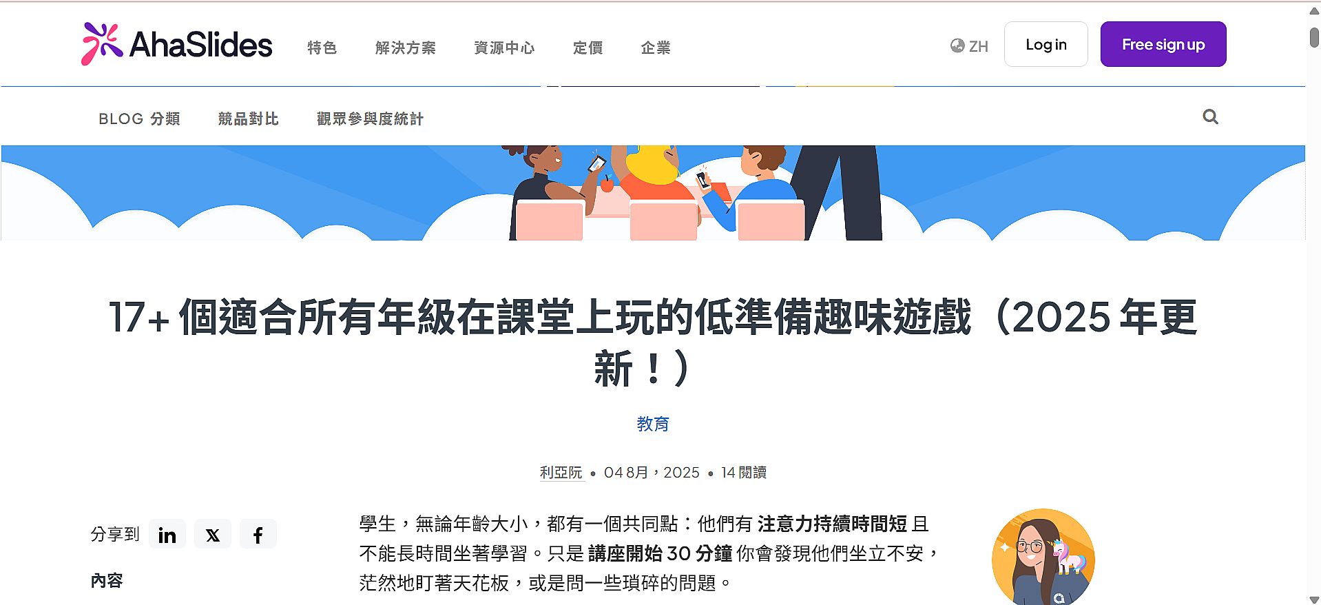 | 1 | ![]() | 網站名稱 17+ 課堂上玩的有趣遊戲 | 2023 年所有年級 網址 https://ahaslides.com/zh-TW/blog/17-fun-games-to-play-in-class-all-grades/ 網站簡介 在課程中經常加入遊戲的五個好處: 注意力: 威斯康星大學研究人員的一項研究表明,在學校里肯定會通過有趣的遊戲來成長,一些樂趣可以極大地提高學生的注意力。 看到你的學生在課堂上沉迷於玩遊戲並不難,因為有趣的課堂遊戲通常是樂觀的,並且需要大量的注意力才能獲勝。 動機: 十幾次,如果課程或課程包含有趣的遊戲,學生通常會期待。 如果他們感到有動力,他們甚至可以克服最困難的學習障礙。 合作: 通過結對或團隊參與課堂遊戲,您的學生最終將學會與他人合作並和諧地工作,因為沒有對錯,只有在路線盡頭可以實現的目標。 感情: 玩遊戲是與學生建立特殊聯繫的好方法。 他們會認為你是一位“酷老師”,除了教授枯燥的話題之外,還知道如何營造一個溫馨的環境並從中獲得樂趣。 學習強化: 課堂遊戲的主要目的是讓學生使用非傳統的教育方法進行學習。 通過將硬知識融入有趣的事物中,您的學生將對學習過程產生積極的記憶,在考試期間更容易回憶起來。 | 劉亭徹 | 2025/9/4 下午 12:42:45 |
