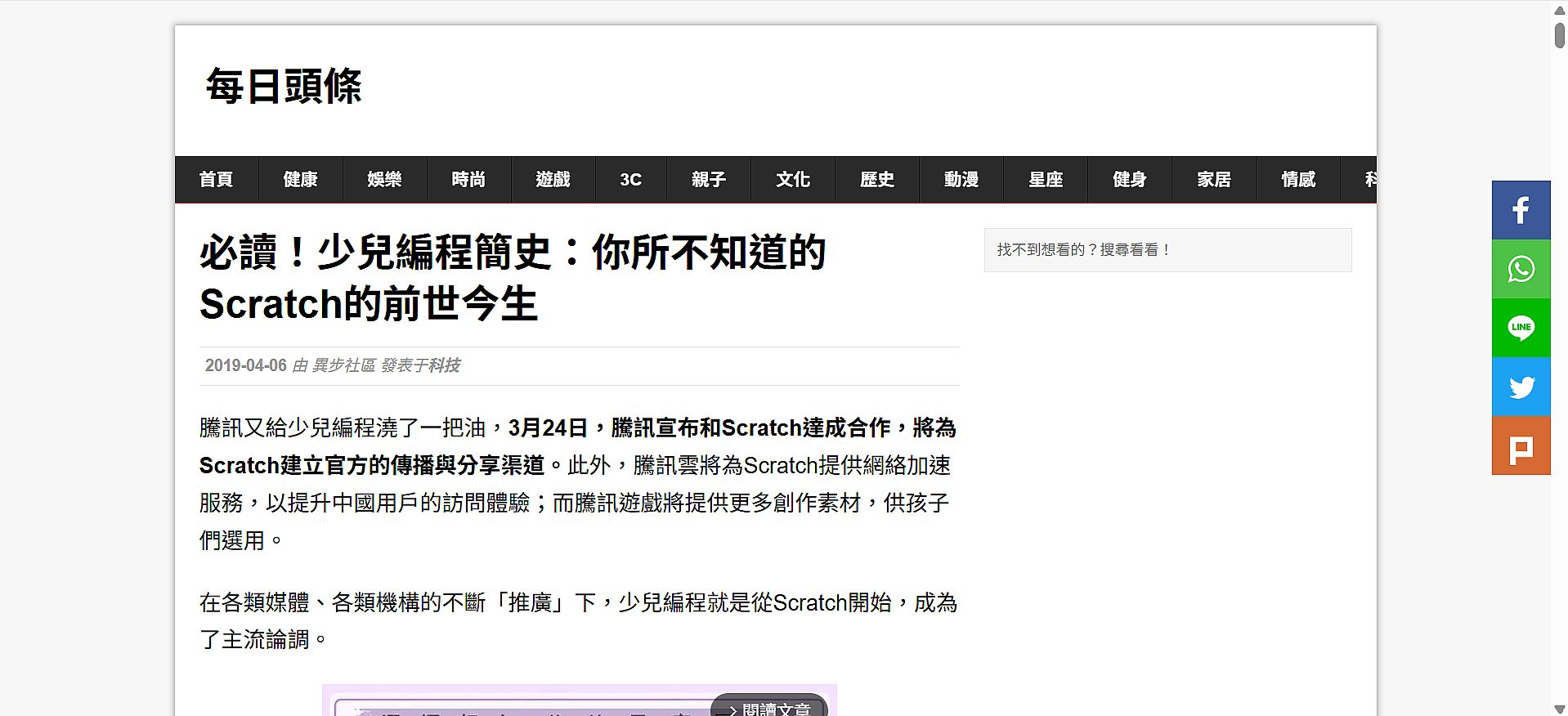 | 3 | ![]() | 網站名稱 必讀!少兒編程簡史:你所不知道的Scratch的前世今生 網址 https://kknews.cc/zh-tw/tech/r5qx244.html 網站簡介 1989年12月,米切爾·雷斯尼克接到了時任波士頓計算機博物館教育主管娜塔莉·臘斯克希望借用一些樂高/LOGO作為活動的材料,活動結束後還不斷地有孩子詢問那些樂高/LOGO組件到哪裡去了。孩子們試用樂高/LOGO的過程使米切爾·雷斯尼克意識到,當時還沒有專門供兒童使用的編程軟體。於是,他決定開發一款適合兒童的認知水平、能夠融入兒童喜歡的媒體形態、具有開放性創造空間的編程軟體,有關Scratch的最初設想也就此開始醞釀。 | 劉亭徹 | 2025/9/4 下午 12:47:10 |