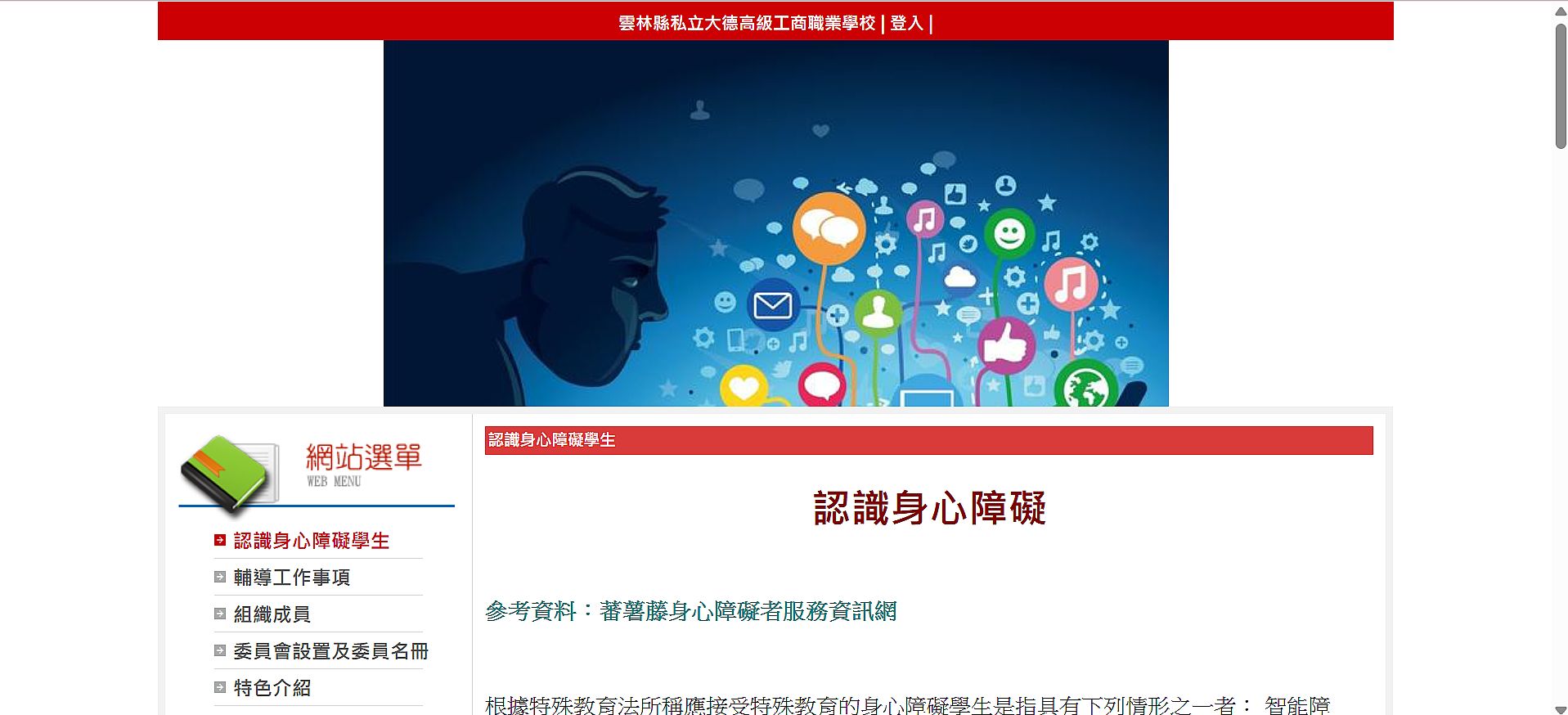 | 5 | ![]() | 網站名稱 輔導室|認識身心障礙學生 網址 http://www.ddvs.ylc.edu.tw/ischool/publish_page/10/?cid=85 網站簡介 肢體障礙是指四肢或驅幹,有缺陷而失去正常的運動機能,使他在實際生活中發生困難, 而需要學校教育特別加以協助者。由於四肢和軀幹是各種動作的主要部位,一旦肢體傷殘, 便會立即而明顯的造成生活上的不方便。肢體傷殘的結果,往往造成生活適應的困難,而需要特別養護、訓練和教育。 | 劉亭徹 | 2025/9/4 下午 12:51:42 |