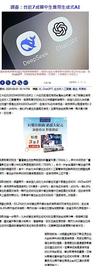 | 1 | ![]() | 網站名稱 調查:台近7成國中生曾用生成式AI 網址 https://www.epochtimes.com/b5/25/9/1/n14585620.htm 網站簡介 【大紀元2025年09月01日訊】(大紀元記者莊璦筠台灣台北報導)為了解學生使用生成式人工智慧情形,國家教育研究院1日公布調查報告顯示,超過九成的九年級學生知道什麼是生成式AI如ChatGPT,但有31%從未使用過,使用頻率以每週使用1-2次最多,占46%,有6.8%學生則是每天使用。主要用途包括寫作業、製作圖片影片、聊天等。 | 陳法旭 | 2025/9/4 下午 04:17:11 |