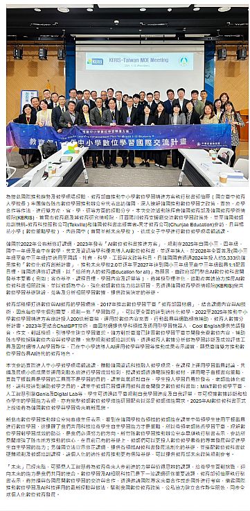 | 2 | ![]() | 網站名稱 AI時代數位學習新未來 與韓交流產官學研經驗分享 網址 https://www.edu.tw/News_Content.aspx?n=9E7AC85F1954DDA8&sms=169B8E91BB75571F&s=12A3B58453FA150B 網站簡介 為接軌國際推動趨勢及教學現場經驗,教育部由推動中小學數位學習精進方案執行秘書郭伯臣(國立臺中教育大學校長)率團偕各縣市數位學習推動辦公室代表出訪韓國,深入瞭解韓國推動數位學習之政策、實施、產學合作等作法,進行雙方產、官、學、研等方面的經驗分享。本次交流活動除拜會韓國教育部及韓國教育學術情報院(KERIS)、首爾市教育廳及其教育研究情報院、江西陽川教育支援廳交流數位學習政策外,並至韓國教師培訓機構-教育科技服務公司(Tekville)和韓國教科書出版業者-天才教育公司(Chunjae Education)參訪,且與楊花小學(數位重點學校)、內谷國中(首爾革新未來學校)、德成女子中學進行數位教學現場觀議課。 | 陳法旭 | 2025/9/4 下午 04:19:14 |