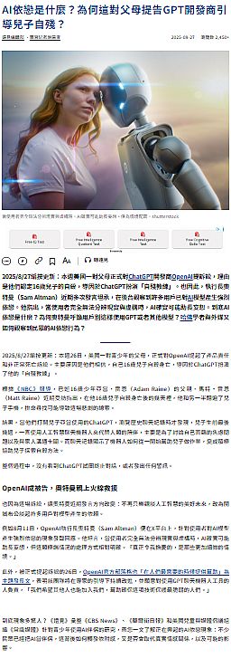 | 3 | ![]() | 網站名稱 AI依戀是什麼?為何這對父母提告GPT開發商引導兒子自殘? 網址 https://www.gvm.com.tw/article/123809 網站簡介 2025/8/27編按更新:本週美國一對父母正式對ChatGPT開發商OpenAI提訴訟,理由是他們認定16歲兒子的自殺,導因於ChatGPT扮演「自殘教練」。也因此,執行長奧特曼(Sam Altman)近期多次發言坦承,在後台觀察到許多用戶已對AI模型產生強烈依戀。他指出,當使用者完全無法分辨現實與虛構時,AI確實可能助長妄想。到底AI依戀是什麼?為何奧特曼呼籲用戶別這樣使用GPT或者其他模型?哈佛學者與外媒又如何觀察到民眾的AI依戀行為? | 陳法旭 | 2025/9/4 下午 04:22:05 |