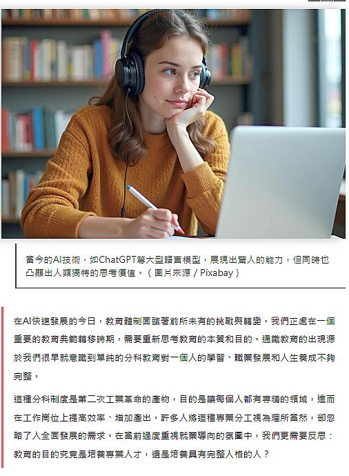| 4 | ![]() | 網站名稱 人工智慧驅動第四波工業革命 AI時代的通識教育與人才培育 網址 https://www.cmmedia.com.tw/home/articles/54737 網站簡介 在AI快速發展的今日,教育體制面臨著前所未有的挑戰與轉變。我們正處在一個重要的教育典範轉移時期,需要重新思考教育的本質和目的。通識教育的出現源於我們很早就意識到單純的分科教育對一個人的學習、職業發展和人生養成不夠完整。 | 陳法旭 | 2025/9/4 下午 04:24:38 |