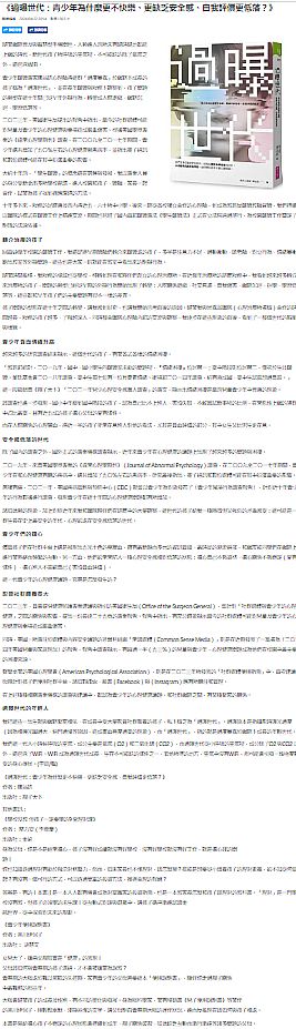 | 5 | ![]() | 網站名稱 過曝世代:青少年為什麼更不快樂、更缺乏安全感、自我評價更低落? 網址 https://www.anntw.com/articles/20240422-lXrk 網站簡介 隨著網路普及與智慧型手機問世,人類進入前所未有隨時隨地都能上網的時代,新世代孩子所呼吸的空氣裡,不可或缺的除了氧氣之外,還包含WiFi。 | 陳法旭 | 2025/9/4 下午 04:27:23 |