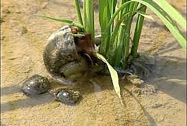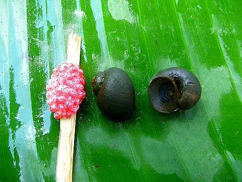 | 4 | 作者 玉田地有限公司 來源 http:\\www.ag168.com 描述 福壽螺又名蘋果螺、金寶螺、龍鳳螺、蘋果螺. 外觀與本省田螺相似,卵為圓形,粉紅至先紅色,其上有臘粉狀物保護,均於夜間產於乾燥物體的表面,如稻悍,溝壁,牆壁,田梗及雜草上,常疊覆成葡萄串狀,色澤鮮豔,極為醒目。 卵期約14天,初孵化幼螺落入水中,以浮游生物為食,幼螺發育至3~4個月即達性成熟 | 李語恒 | 2025/10/2 上午 09:39:43 | |