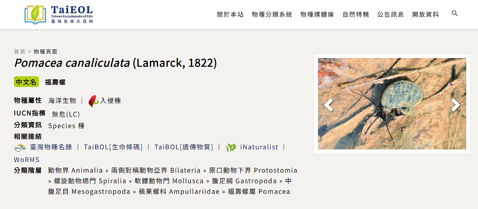 | 2 | ![]() | 網站名稱 台灣生命大百科 網址 https://taieol.tw/pages/135662 網站簡介 大型淡水螺類(殼高達10公分),呈球狀。外殼為棕或綠色,具帶狀螺紋環繞。某些水族寵物品種外殼呈淺金黃色;體色、體型差異大。福壽螺在水中以腮呼吸,育水質惡劣或缺氧時自頭部左後方伸出呼吸管(siphon)至水面,頭部反覆上下彎動,將空氣引入肺囊進行呼吸。肺囊位於外套膜左側,有發達的血管循環系。在乾燥環境下螺體縮入殼內緊閉口蓋,成體在這種乾旱條件下可忍受3個月以上不會死亡 | 郭昱瑋 | 2025/10/2 上午 09:49:17 |