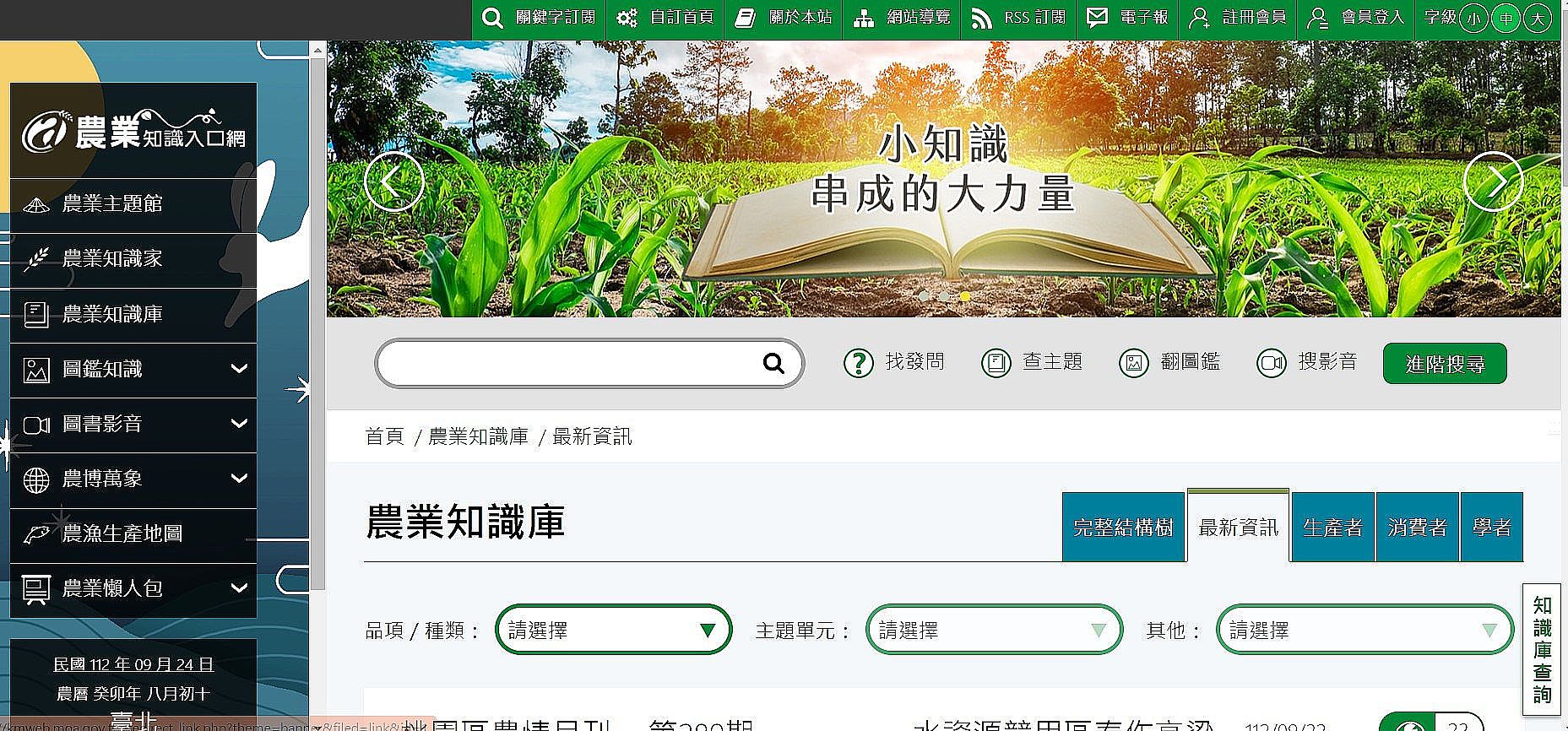 | 4 | ![]() | 網站名稱 農業知識入口網 網址 https://kmweb.moa.gov.tw/ 網站簡介 「發展重要農業產業知識管理應用計畫」 為協助農民及農民團體取得農業生產及經營管理之核心知識,改善生產管理、經營績效與創新,相關具體工作重點包括規劃建立農業知識庫;蒐集及探索農業知識元件,發展農業知識檢索工具;規劃建置總體農業環境資料庫,開發知識管理資訊應用系統,逐步建立功能模組化專家系統,推廣及宣傳農業知識管理運用。 | 郭昱瑋 | 2025/10/2 上午 09:50:30 |