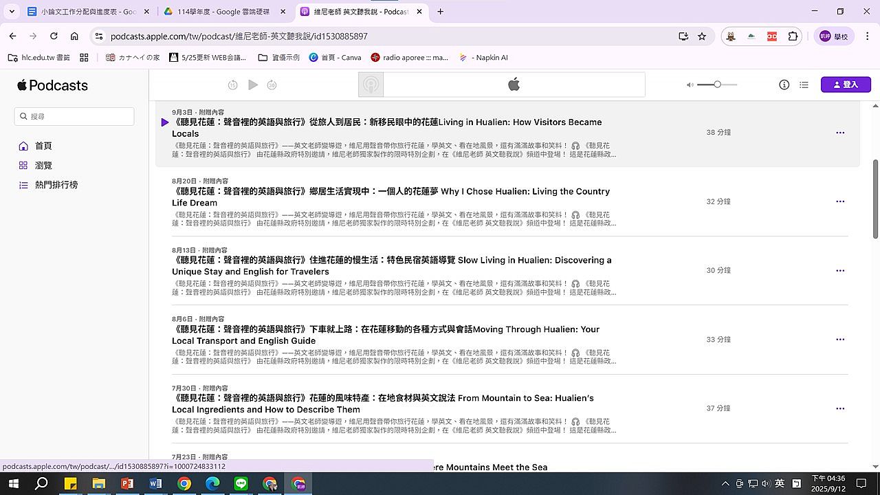 | 2 | ![]() | 網站名稱 維尼老師 英文聽我說 網址 https://podcasts.apple.com/tw/podcast/%E7%B6%AD%E5%B0%BC%E8%80%81%E5%B8%AB-%E8%8B%B1%E6%96%87%E8%81%BD%E6%88%91%E8%AA%AA/id1530885897 網站簡介 由花蓮縣政府邀請,維尼老師在fB找花蓮的新住民,請他們分享來花蓮做的事。 | 呂璨亨 | 2025/9/12 下午 04:37:47 |