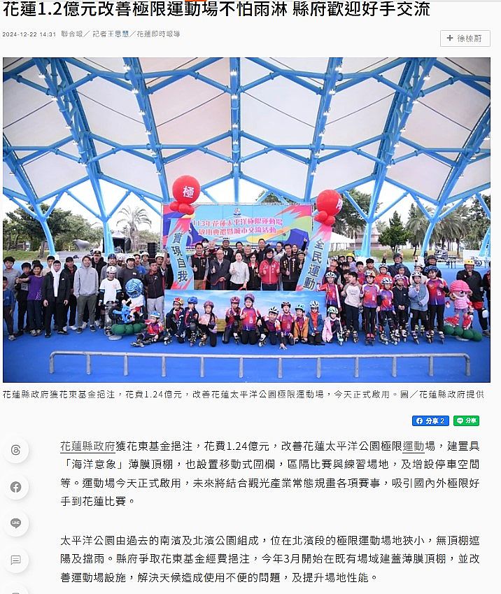 | 4 | ![]() | 網站名稱 花蓮1.2億元改善極限運動場不怕雨淋 縣府歡迎好手交流 網址 https://udn.com/news/story/7328/8441889 網站簡介 花蓮現有的極限運動場位於太平洋公園北濱段,2024年斥資1.24億元改善啟用,增設頂棚、圍欄與觀眾席,提供滑板、直排輪與BMX使用。縣府同時規劃於南區玉里鎮打造極限運動公園,未來將結合觀光舉辦國內外賽事。 | 趙璽文 | 2025/9/18 下午 04:54:45 |