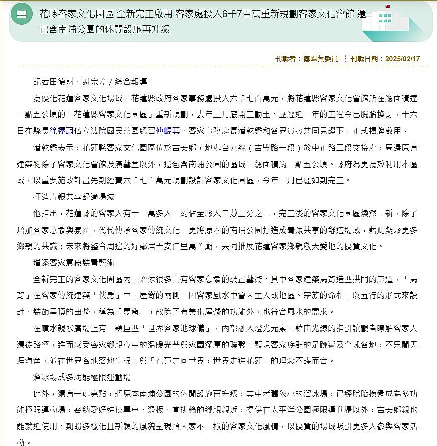 | 5 | ![]() | 網站名稱 花縣客家文化園區 全新完工啟用 客家處投入6千7百萬重新規劃客家文化會館 還包含南埔公園的休閒設施再升級 網址 https://www.ly.gov.tw/Pages/Detail.aspx?nodeid=54301&pid=248704 網站簡介 花蓮縣客家文化園區位於吉安鄉,總面積約 1.5 公頃,歷經近一年整建後於 2025 年 2 月正式啟用。園區將原本老舊的南埔公園溜冰場升級為多功能極限運動場,提供特技單車、滑板與直排輪使用,讓吉安鄉親可就近體驗極限運動。此外,園區融合客家意象與裝置藝術,如馬背造型拱門與「世界客家地球儀」,兼具文化傳承與休閒娛樂功能,打造青銀共享、全年齡皆宜的舒適場域。 | 趙璽文 | 2025/9/18 下午 04:55:31 |