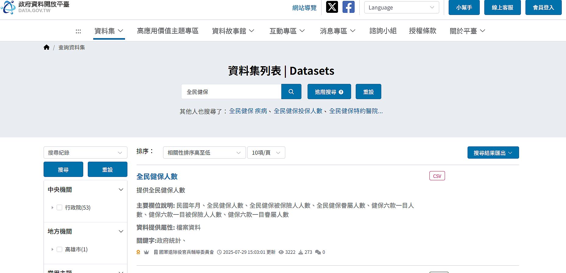 | 1 | ![]() | 網站名稱 政府資料開放平台 網址 https://data.gov.tw/datasets/search?p=1&size=10&s=_score_desc&rft=%E5%85%A8%E6%B0%91%E5%81%A5%E4%BF%9D 網站簡介 由我國政府建立的公開資訊網站,目的在於讓各機關蒐集與產生的資料能夠透明化並提供大眾使用。平臺上的資料種類非常多,包括交通、醫療、教育、環境等領域,民眾可以免費下載並加以分析或應用。透過這樣的公開方式,不僅能提升政府施政的透明度,也能鼓勵創新應用,例如開發新服務或研究公共政策。政府資料開放平臺不僅是資訊共享的重要管道,更是推動數位治理與公民參與的基礎。 | 卞蜚 | 2025/9/22 下午 10:24:11 |