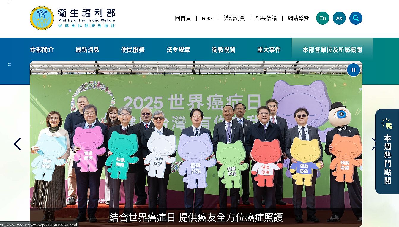 | 3 | ![]() | 網站名稱 衛生福利部 網址 https://www.mohw.gov.tw/mp-1.html 網站簡介 是我國負責推動公共衛生與社會福利政策的中央機關,成立於2013年,由原行政院衛生署改制而成。其業務範圍涵蓋醫療服務、疾病防治、食品藥物管理、健保制度規劃,以及老人、兒童、身心障礙者等各項社會福利措施。衛福部的目標在於守護全民健康,並促進社會安全與公平,讓人民享有完善的醫療照護與生活支持。透過政策規劃與資源整合,衛福部致力於建立更健全的健康照護體系與社會安全網,是國家社會發展的重要推手。 | 卞蜚 | 2025/9/23 下午 02:53:54 |